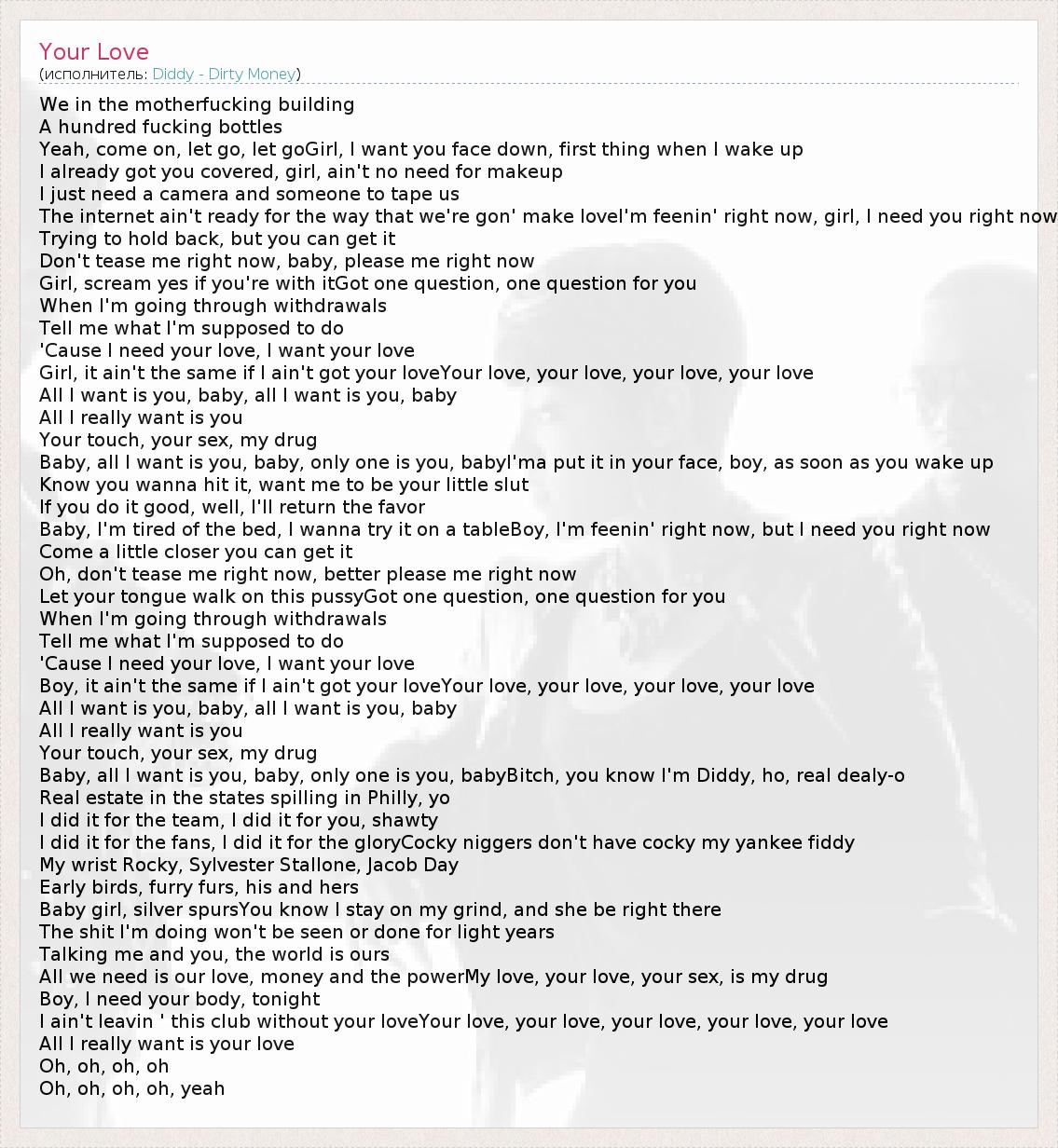 We in the motherfucking building A hundred fucking bottles Yeah, come on, let go, let goGirl, I want you face down, first thing when I wake up I already got you covered, girl, ain't no need for makeup I just need a camera and someone to tape us The internet ain't ready for the way that we're gon' make loveI'm feenin' right now, girl, I need you right now Trying to hold back, but you can get it Don't tease me right now, baby, please me right now Girl, scream yes if you're with itGot one question, one question for you When I'm going through withdrawals Tell me what I'm supposed to do 'Cause I need your love, I want your love Girl, it ain't the same if I ain't got your loveYour love, your love, your love, your love All I want is you, baby, all I want is you, baby All I really want is you Your touch, your sex, my drug Baby, all I want is you, baby, only one is you, babyI'ma put it in your face, boy, as soon as you wake up Know you wanna hit it, want me to be your little slut If you do it good, well, I'll return the favor Baby, I'm tired of the bed, I wanna try it on a tableBoy, I'm feenin' right now, but I need you right now Come a little closer you can get it Oh, don't tease me right now, better please me right now Let your tongue walk on this pussyGot one question, one question for you When I'm going through withdrawals Tell me what I'm supposed to do 'Cause I need your love, I want your love Boy, it ain't the same if I ain't got your loveYour love, your love, your love, your love All I want is you, baby, all I want is you, baby All I really want is you Your touch, your sex, my drug Baby, all I want is you, baby, only one is you, babyBitch, you know I'm Diddy, ho, real dealy-o Real estate in the states spilling in Philly, yo I did it for the team, I did it for you, shawty I did it for the fans, I did it for the gloryCocky niggers don't have cocky my yankee fiddy My wrist Rocky, Sylvester Stallone, Jacob Day Early birds, furry furs, his and hers Baby girl, silver spursYou know I stay on my grind, and she be right there The shit I'm doing won't be seen or done for light years Talking me and you, the world is ours All we need is our love, money and the powerMy love, your love, your sex, is my drug Boy, I need your body, tonight I ain't leavin ' this club without your loveYour love, your love, your love, your love, your love All I really want is your love Oh, oh, oh, oh Oh, oh, oh, oh, yeah