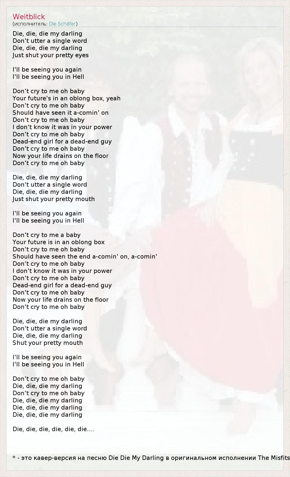 Die, die, die my darling Don't utter a single word Die, die, die my darling Just shut your pretty eyes I'll be seeing you again I'll be seeing you in Hell Don't cry to me oh baby Your future's in an oblong box, yeah Don't cry to me oh baby Should have seen it a-comin' on Don't cry to me oh baby I don't know it was in your power Don't cry to me oh baby Dead-end girl for a dead-end guy Don't cry to me oh baby Now your life drains on the floor Don't cry to me oh baby Die, die, die my darling Don't utter a single word Die, die, die my darling Just shut your pretty mouth I'll be seeing you again I'll be seeing you in Hell Don't cry to me a baby Your future is in an oblong box Don't cry to me oh baby Should have seen the end a-comin' on, a-comin' Don't cry to me oh baby I don't know it was in your power Don't cry to me oh baby Dead-end girl for a dead-end guy Don't cry to me oh baby Now your life drains on the floor Don't cry to me oh baby Die, die, die my darling Don't utter a single word Die, die, die my darling Shut your pretty mouth I'll be seeing you again I'll be seeing you in Hell Don't cry to me oh baby Die, die, die my darling Don't cry to me oh baby Die, die, die my darling Die, die, die my darling Die, die, die my darling Die, die, die, die, die, die.... * - это кавер-версия на песню Die Die My Darling в оригинальном исполнении The Misfits