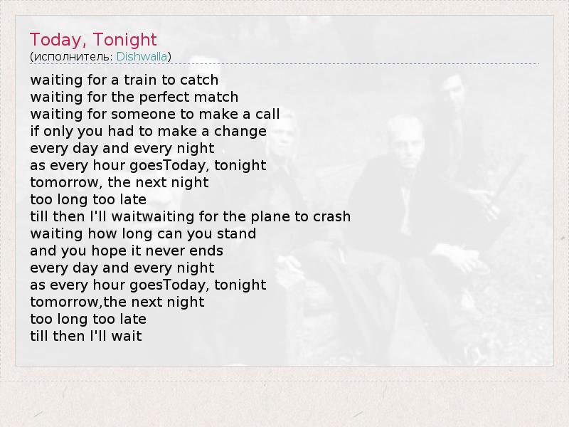 waiting for a train to catch waiting for the perfect match waiting for someone to make a call if only you had to make a change every day and every night as every hour goesToday, tonight tomorrow, the next night too long too late till then I'll waitwaiting for the plane to crash waiting how long can you stand and you hope it never ends every day and every night as every hour goesToday, tonight tomorrow,the next night too long too late till then I'll wait