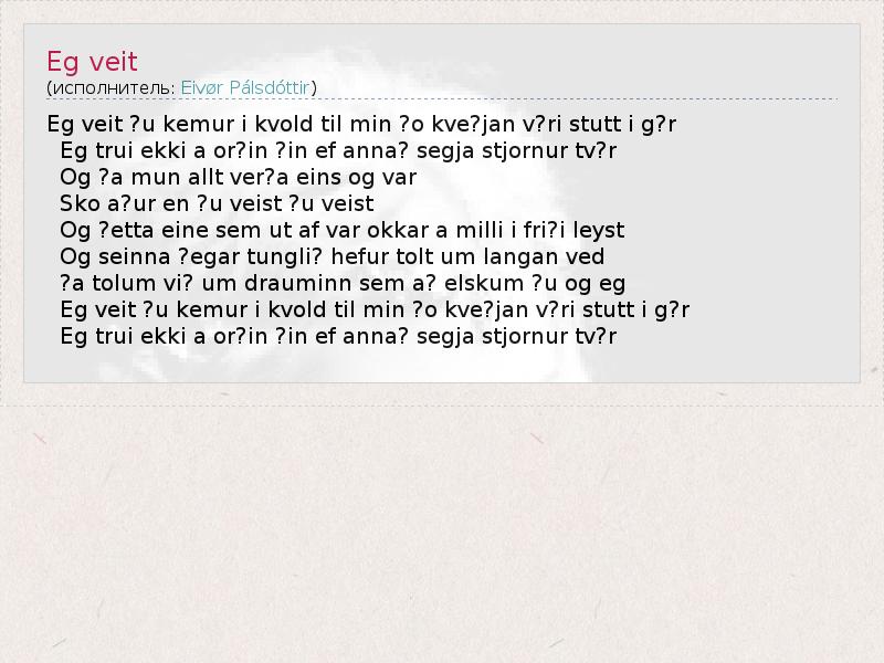 Это интересно:Эйвор Паульсдоуттир— фарерская певица и автор песен. В её творчестве смешиваются элементы джаза, фолка, кантри, рока а также классической и христианской музыки. За её манеру исполнения певицу часто называют фарерской Бьорк.В двенадцатилетнем возрасте Айвёр выступала в составе фарерского хора в Италии. В 13 лет она впервые появилась на фарерском телевидении и в том же году стала победительницей... продолжение