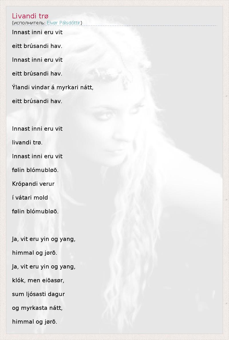 Innast inni eru vit eitt brúsandi hav. Innast inni eru vit eitt brúsandi hav. Ýlandi vindar á myrkari nátt, eitt brúsandi hav. Innast inni eru vit livandi trø. Innast inni eru vit følin blómubløð. Krópandi verur í vátari mold følin blómubløð. Ja, vit eru yin og yang, himmal og jørð. Ja, vit eru yin og yang, klók, men eiðasør, sum ljósasti dagur og myrkasta nátt, himmal og jørð.