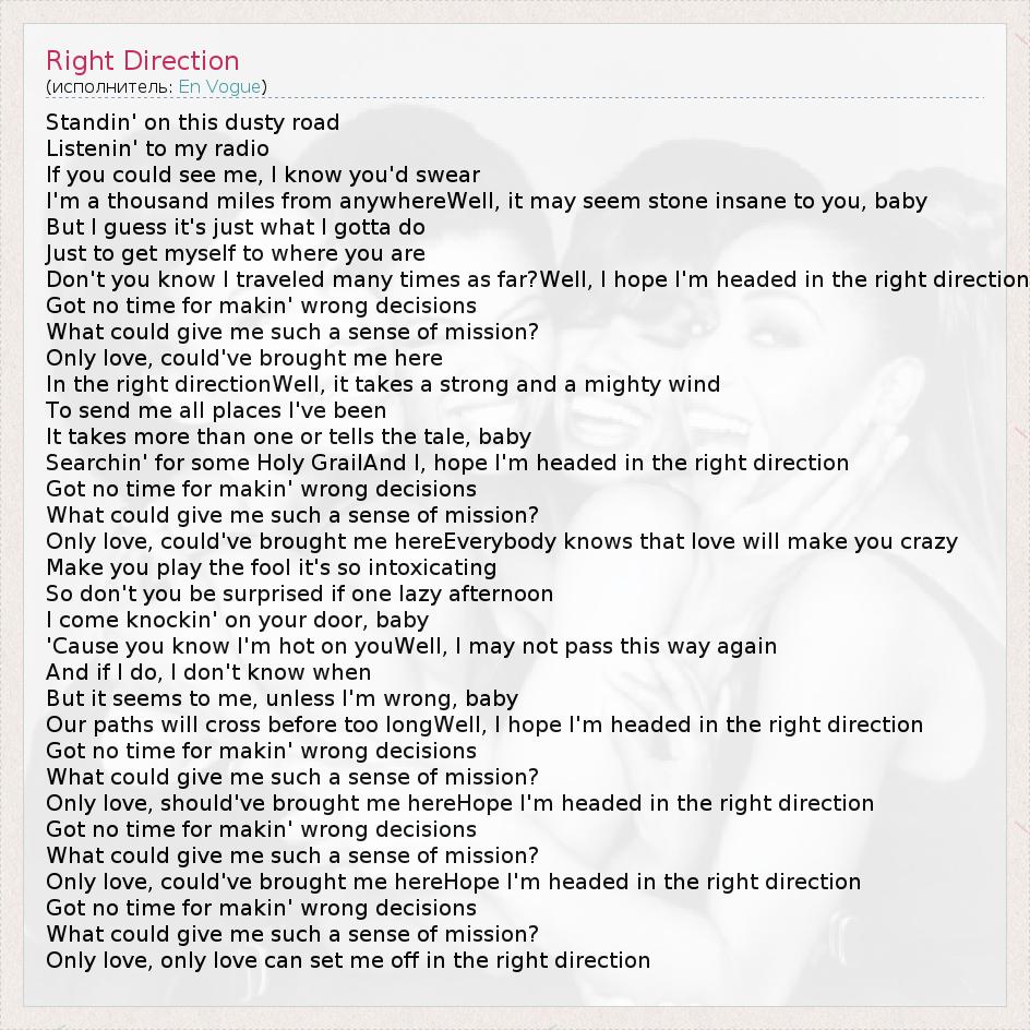 Standin' on this dusty road Listenin' to my radio If you could see me, I know you'd swear I'm a thousand miles from anywhereWell, it may seem stone insane to you, baby But I guess it's just what I gotta do Just to get myself to where you are Don't you know I traveled many times as far?Well, I hope I'm headed in the right direction Got no time for makin' wrong decisions What could give me such a sense of mission? Only love, could've brought me here In the right directionWell, it takes a strong and a mighty wind To send me all places I've been It takes more than one or tells the tale, baby Searchin' for some Holy GrailAnd I, hope I'm headed in the right direction Got no time for makin' wrong decisions What could give me such a sense of mission? Only love, could've brought me hereEverybody knows that love will make you crazy Make you play the fool it's so intoxicating So don't you be surprised if one lazy afternoon I come knockin' on your door, baby 'Cause you know I'm hot on youWell, I may not pass this way again And if I do, I don't know when But it seems to me, unless I'm wrong, baby Our paths will cross before too longWell, I hope I'm headed in the right direction Got no time for makin' wrong decisions What could give me such a sense of mission? Only love, should've brought me hereHope I'm headed in the right direction Got no time for makin' wrong decisions What could give me such a sense of mission? Only love, could've brought me hereHope I'm headed in the right direction Got no time for makin' wrong decisions What could give me such a sense of mission? Only love, only love can set me off in the right direction
