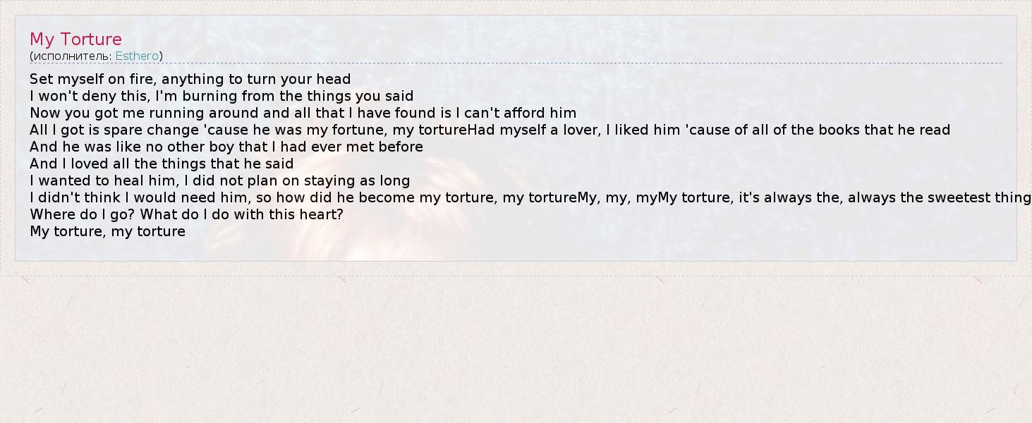 Set myself on fire, anything to turn your head I won't deny this, I'm burning from the things you said Now you got me running around and all that I have found is I can't afford him All I got is spare change 'cause he was my fortune, my tortureHad myself a lover, I liked him 'cause of all of the books that he read And he was like no other boy that I had ever met before And I loved all the things that he said I wanted to heal him, I did not plan on staying as long I didn't think I would need him, so how did he become my torture, my tortureMy, my, myMy torture, it's always the, always the sweetest thing Where do I go? What do I do with this heart? My torture, my torture