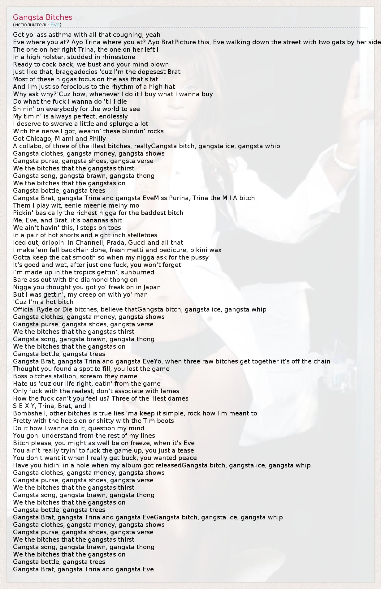 Gangsta Brat, gangsta Trina and gangsta EveGangsta bitch, gangsta ice, gangsta whip
