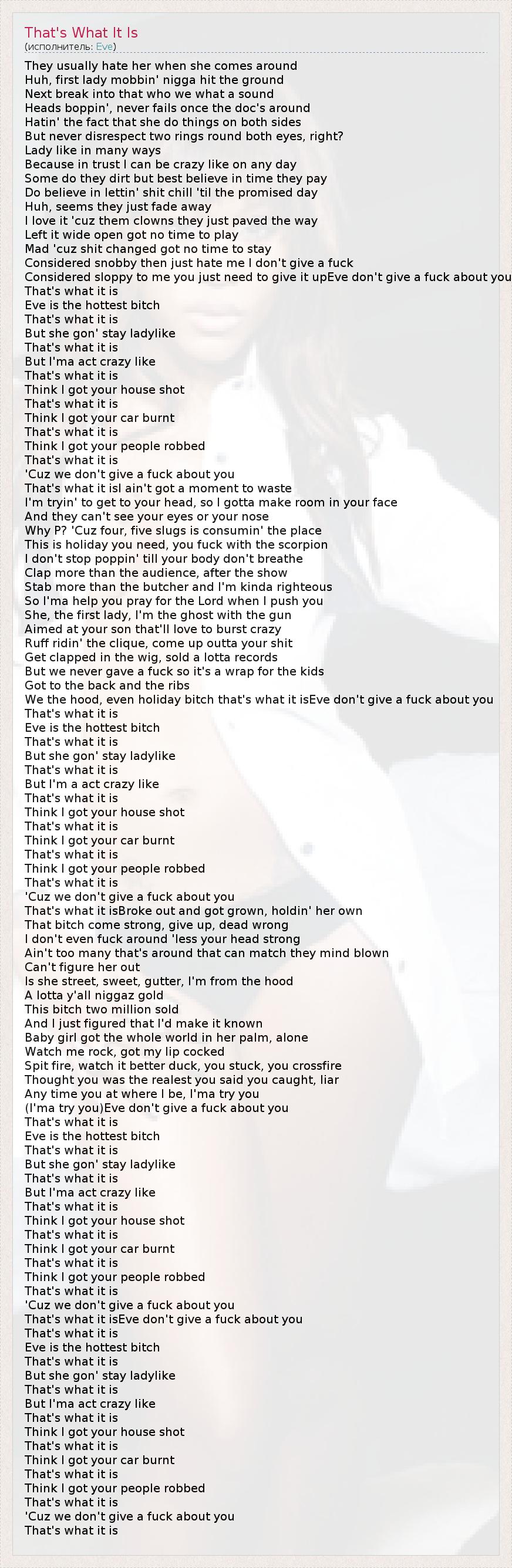 They usually hate her when she comes around Huh, first lady mobbin' nigga hit the ground Next break into that who we what a sound Heads boppin', never fails once the doc's around Hatin' the fact that she do things on both sides But never disrespect two rings round both eyes, right? Lady like in many ways Because in trust I can be crazy like on any day Some do they dirt but best believe in time they pay Do believe in lettin' shit chill 'til the promised day Huh, seems they just fade away I love it 'cuz them clowns they just paved the way Left it wide open got no time to play Mad 'cuz shit changed got no time to stay Considered snobby then just hate me I don't give a fuck Considered sloppy to me you just need to give it upEve don't give a fuck about you That's what it is Eve is the hottest bitch That's what it is But she gon' stay ladylike That's what it is But I'ma act crazy like That's what it is Think I got your house shot That's what it is Think I got your car burnt That's what it is Think I got your people robbed That's what it is 'Cuz we don't give a fuck about you That's what it isI ain't got a moment to waste I'm tryin' to get to your head, so I gotta make room in your face And they can't see your eyes or your nose Why P? 'Cuz four, five slugs is consumin' the place This is holiday you need, you fuck with the scorpion I don't stop poppin' till your body don't breathe Clap more than the audience, after the show Stab more than the butcher and I'm kinda righteous So I'ma help you pray for the Lord when I push you She, the first lady, I'm the ghost with the gun Aimed at your son that'll love to burst crazy Ruff ridin' the clique, come up outta your shit Get clapped in the wig, sold a lotta records But we never gave a fuck so it's a wrap for the kids Got to the back and the ribs We the hood, even holiday bitch that's what it isEve don't give a fuck about you That's what it is Eve is the hottest bitch That's what it is But she gon' stay ladylike That's what it is But I'm a act crazy like That's what it is Think I got your house shot That's what it is Think I got your car burnt That's what it is Think I got your people robbed That's what it is 'Cuz we don't give a fuck about you That's what it isBroke out and got grown, holdin' her own That bitch come strong, give up, dead wrong I don't even fuck around 'less your head strong Ain't too many that's around that can match they mind blown Can't figure her out Is she street, sweet, gutter, I'm from the hood A lotta y'all niggaz gold This bitch two million sold And I just figured that I'd make it known Baby girl got the whole world in her palm, alone Watch me rock, got my lip cocked Spit fire, watch it better duck, you stuck, you crossfire Thought you was the realest you said you caught, liar Any time you at where I be, I'ma try you (I'ma try you)Eve don't give a fuck about you That's what it is Eve is the hottest bitch That's what it is But she gon' stay ladylike That's what it is But I'ma act crazy like That's what it is Think I got your house shot That's what it is Think I got your car burnt That's what it is Think I got your people robbed That's what it is 'Cuz we don't give a fuck about you That's what it isEve don't give a fuck about you That's what it is Eve is the hottest bitch That's what it is But she gon' stay ladylike That's what it is But I'ma act crazy like That's what it is Think I got your house shot That's what it is Think I got your car burnt That's what it is Think I got your people robbed That's what it is 'Cuz we don't give a fuck about you That's what it is