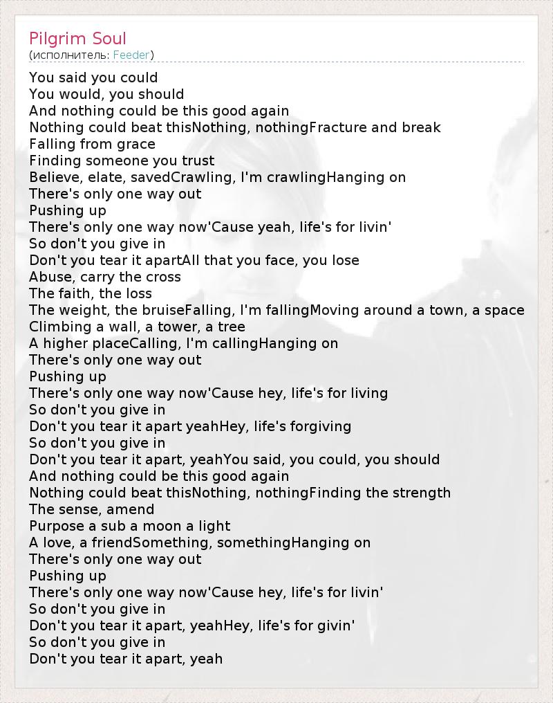 You said you could You would, you should And nothing could be this good again Nothing could beat thisNothing, nothingFracture and break Falling from grace Finding someone you trust Believe, elate, savedCrawling, I'm crawlingHanging on There's only one way out Pushing up There's only one way now'Cause yeah, life's for livin' So don't you give in Don't you tear it apartAll that you face, you lose Abuse, carry the cross The faith, the loss The weight, the bruiseFalling, I'm fallingMoving around a town, a space Climbing a wall, a tower, a tree A higher placeCalling, I'm callingHanging on There's only one way out Pushing up There's only one way now'Cause hey, life's for living So don't you give in Don't you tear it apart yeahHey, life's forgiving So don't you give in Don't you tear it apart, yeahYou said, you could, you should And nothing could be this good again Nothing could beat thisNothing, nothingFinding the strength The sense, amend Purpose a sub a moon a light A love, a friendSomething, somethingHanging on There's only one way out Pushing up There's only one way now'Cause hey, life's for livin' So don't you give in Don't you tear it apart, yeahHey, life's for givin' So don't you give in Don't you tear it apart, yeah