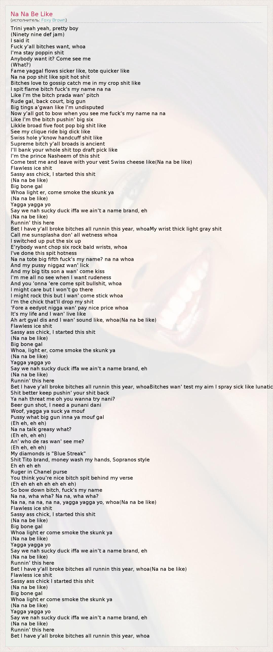 Trini yeah yeah, pretty boy (Ninety nine def jam) I said it Fuck y'all bitches want, whoa I'ma stay poppin shit Anybody want it? Come see me (What?) Fame yaggaI flows sicker like, tote quicker like Na na pop shit like spit hot shit Bitches love to gossip catch me in my crop shit like I spit flame bitch fuck's my name na na Like I'm the bitch prada wan' pitch Rude gal, back court, big gun Big tings a'gwan like I'm undisputed Now y'all got to bow when you see me fuck's my name na na Like I'm the bitch pushin' big six Likkle broad five foot pop big shit like See my clique ride big dick like Swiss hole y'know handcuff shit like Supreme bitch y'all broads is ancient I'll bank your whole shit top draft pick like I'm the prince Nasheem of this shit Come test me and leave with your vest Swiss cheese like(Na na be like) Flawless ice shit Sassy ass chick, I started this shit (Na na be like) Big bone gal Whoa light er, come smoke the skunk ya (Na na be like) Yagga yagga yo Say we nah sucky duck iffa we ain't a name brand, eh (Na na be like) Runnin' this here Bet I have y'all broke bitches all runnin this year, whoaMy wrist thick light gray shit Call me sunsplasha don' all wetness whoa I switched up put the six up E'rybody want chop six rock bald wrists, whoa I've done this spit hotness Na na tote big fifth fuck's my name? na na whoa And my pussy niggaz wan' lick And my big tits son a wan' come kiss I'm me all no see when I want rudeness And you 'onna 'ere come spit bullshit, whoa I might care but I won't go there I might rock this but I wan' come stick whoa I'm the chick that'll drop my shit 'Fore a eedyot nigga wan' pay nice price whoa It's my life and I wan' live like Ah art gyal dis and I wan' sound like, whoa(Na na be like) Flawless ice shit Sassy ass chick, I started this shit (Na na be like) Big bone gal Whoa, light er, come smoke the skunk ya (Na na be like) Yagga yagga yo Say we nah sucky duck iffa we ain't a name brand, eh (Na na be like) Runnin' this here Bet I have y'all broke bitches all runnin this year, whoaBitches wan' test my aim I spray sick like lunatic Shit better keep pushin' your shit back Ya nah threat me oh you wanna try nani? Beer gun shot, I need a punani dani Woof, yagga ya suck ya mouf Pussy what big gun inna ya mouf gal (Eh eh, eh eh) Na na talk greasy what? (Eh eh, eh eh) An' who de ras wan' see me? (Eh eh, eh eh) My diamonds is "Blue Streak" Shit Tito brand, money wash my hands, Sopranos style Eh eh eh eh Ruger in Chanel purse You think you're nice bitch spit behind my verse (Eh eh eh eh eh eh eh eh) So bow down bitch, fuck's my name Na na, wha wha? Na na, wha wha? Na na, na na, na na, yagga yagga yo, whoa(Na na be like) Flawless ice shit Sassy ass chick, I started this shit (Na na be like) Big bone gal Whoa light er come smoke the skunk ya (Na na be like) Yagga yagga yo Say we nah sucky duck iffa we ain't a name brand, eh (Na na be like) Runnin' this here Bet I have y'all broke bitches all runnin this year, whoa(Na na be like) Flawless ice shit Sassy ass chick I started this shit (Na na be like) Big bone gal Whoa light er come smoke the skunk ya (Na na be like) Yagga yagga yo Say we nah sucky duck iffa we ain't a name brand, eh (Na na be like) Runnin' this here Bet I have y'all broke bitches all runnin this year, whoa