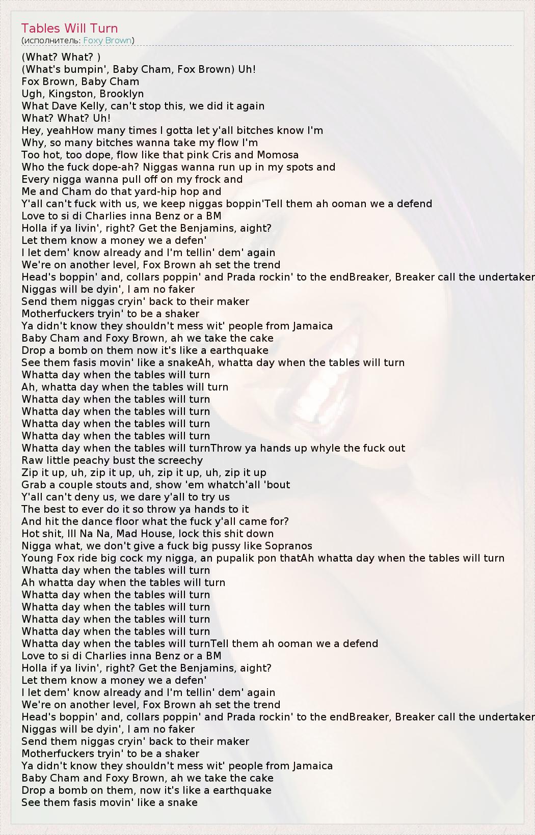 (What? What? ) (What's bumpin', Baby Cham, Fox Brown) Uh! Fox Brown, Baby Cham Ugh, Kingston, Brooklyn What Dave Kelly, can't stop this, we did it again What? What? Uh! Hey, yeahHow many times I gotta let y'all bitches know I'm Why, so many bitches wanna take my flow I'm Too hot, too dope, flow like that pink Cris and Momosa Who the fuck dope-ah? Niggas wanna run up in my spots and Every nigga wanna pull off on my frock and Me and Cham do that yard-hip hop and Y'all can't fuck with us, we keep niggas boppin'Tell them ah ooman we a defend Love to si di Charlies inna Benz or a BM Holla if ya livin', right? Get the Benjamins, aight? Let them know a money we a defen' I let dem' know already and I'm tellin' dem' again We're on another level, Fox Brown ah set the trend Head's boppin' and, collars poppin' and Prada rockin' to the endBreaker, Breaker call the undertaker Niggas will be dyin', I am no faker Send them niggas cryin' back to their maker Motherfuckers tryin' to be a shaker Ya didn't know they shouldn't mess wit' people from Jamaica Baby Cham and Foxy Brown, ah we take the cake Drop a bomb on them now it's like a earthquake See them fasis movin' like a snakeAh, whatta day when the tables will turn Whatta day when the tables will turn Ah, whatta day when the tables will turn Whatta day when the tables will turn Whatta day when the tables will turn Whatta day when the tables will turn Whatta day when the tables will turn Whatta day when the tables will turnThrow ya hands up whyle the fuck out Raw little peachy bust the screechy Zip it up, uh, zip it up, uh, zip it up, uh, zip it up Grab a couple stouts and, show 'em whatch'all 'bout Y'all can't deny us, we dare y'all to try us The best to ever do it so throw ya hands to it And hit the dance floor what the fuck y'all came for? Hot shit, Ill Na Na, Mad House, lock this shit down Nigga what, we don't give a fuck big pussy like Sopranos Young Fox ride big cock my nigga, an pupalik pon thatAh whatta day when the tables will turn Whatta day when the tables will turn Ah whatta day when the tables will turn Whatta day when the tables will turn Whatta day when the tables will turn Whatta day when the tables will turn Whatta day when the tables will turn Whatta day when the tables will turnTell them ah ooman we a defend Love to si di Charlies inna Benz or a BM Holla if ya livin', right? Get the Benjamins, aight? Let them know a money we a defen' I let dem' know already and I'm tellin' dem' again We're on another level, Fox Brown ah set the trend Head's boppin' and, collars poppin' and Prada rockin' to the endBreaker, Breaker call the undertaker Niggas will be dyin', I am no faker Send them niggas cryin' back to their maker Motherfuckers tryin' to be a shaker Ya didn't know they shouldn't mess wit' people from Jamaica Baby Cham and Foxy Brown, ah we take the cake Drop a bomb on them, now it's like a earthquake See them fasis movin' like a snake