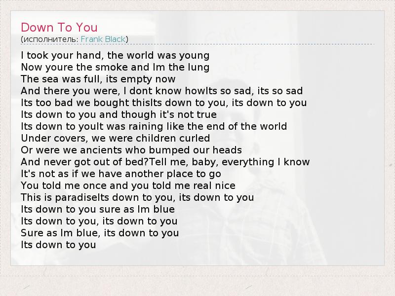 I took your hand, the world was young Now youre the smoke and Im the lung The sea was full, its empty now And there you were, I dont know howIts so sad, its so sad Its too bad we bought thisIts down to you, its down to you Its down to you and though it's not true Its down to youIt was raining like the end of the world Under covers, we were children curled Or were we ancients who bumped our heads And never got out of bed?Tell me, baby, everything I know It's not as if we have another place to go You told me once and you told me real nice This is paradiseIts down to you, its down to you Its down to you sure as Im blue Its down to you, its down to you Sure as Im blue, its down to you Its down to you