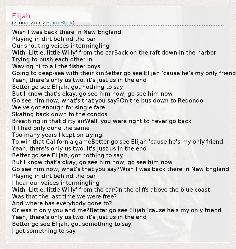 Wish I was back there in New England Playing in dirt behind the bar Our shouting voices intermingling With 'Little, little Willy' from the carBack on the raft down in the harbor Trying to push each other in Waving hi to all the fisher boys Going to deep-sea with their kinBetter go see Elijah 'cause he's my only friend Yeah, there's only us two, it's just us in the end Better go see Elijah, got nothing to say But I know that's okay, go see him now, go see him now Go see him now, what's that you say?On the bus down to Redondo We've got enough for single fare Skating back down to the condos Breathing in that dirty airWell, you were right to never go back If I had only done the same Too many years I kept on trying To win that California gameBetter go see Elijah 'cause he's my only friend Yeah, there's only us two, it's just us in the end Better go see Elijah, got nothing to say But I know that's okay, go see him now, go see him now Go see him now, what's that you say?Wish I was back there in New England Playing in dirt behind the bar I hear our voices intermingling With 'Little, little Willy' from the carOn the cliffs above the blue coast Was that the last time we were free? And where has everybody gone to? Or was it only you and me?Better go see Elijah 'cause he's my only friend Yeah, there's only us two, it's just us in the end Better go see Elijah, got something to say I got something to say