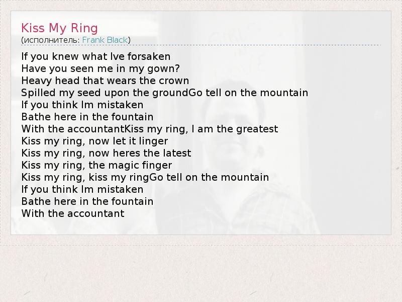 If you knew what Ive forsaken Have you seen me in my gown? Heavy head that wears the crown Spilled my seed upon the groundGo tell on the mountain If you think Im mistaken Bathe here in the fountain With the accountantKiss my ring, I am the greatest Kiss my ring, now let it linger Kiss my ring, now heres the latest Kiss my ring, the magic finger Kiss my ring, kiss my ringGo tell on the mountain If you think Im mistaken Bathe here in the fountain With the accountant