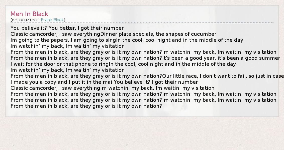 Это интересно:Легенда американского инди-рока Чарльз Майкл Киттредж Томпсон IV, более известный под псевдонимами Блэк Фрэнсис и Фрэнк Блэк, родился 6 апреля 1965 года в Бостоне. Отец будущей легенды был владельцем бара, и поэтому свои первые годы жизни Чарли Томпсон провёл в Лос-Анджелесе. По воспоминаниям самого Чарльза, «отец перевез семью в Лос-Анджелес, поскольку хотел лучше изучить ресторанный бизнес».С... продолжение