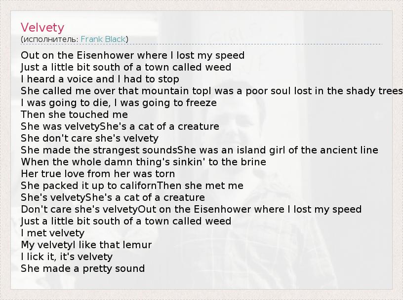 Don't care she's velvetyOut on the Eisenhower where I lost my speed