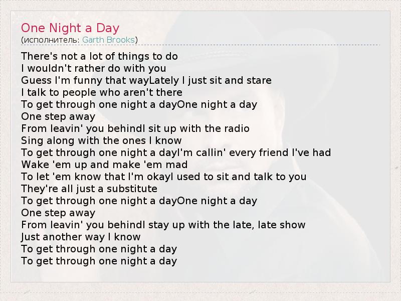 There's not a lot of things to do I wouldn't rather do with you Guess I'm funny that wayLately I just sit and stare I talk to people who aren't there To get through one night a dayOne night a day One step away From leavin' you behindI sit up with the radio Sing along with the ones I know To get through one night a dayI'm callin' every friend I've had Wake 'em up and make 'em mad To let 'em know that I'm okayI used to sit and talk to you They're all just a substitute To get through one night a dayOne night a day One step away From leavin' you behindI stay up with the late, late show Just another way I know To get through one night a day To get through one night a day