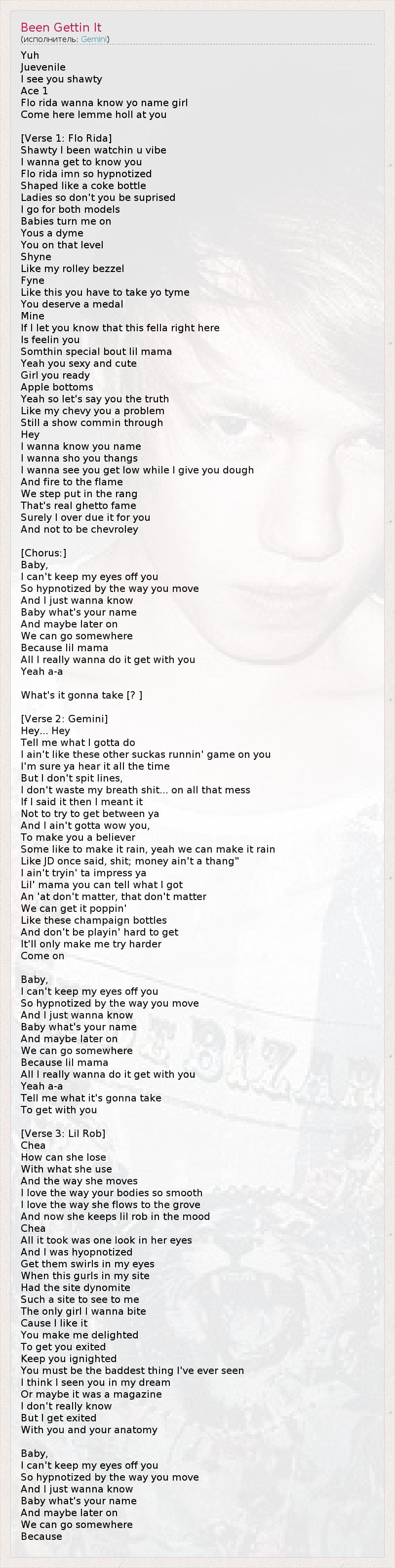 Yuh Juevenile I see you shawty Ace 1 Flo rida wanna know yo name girl Come here lemme holl at you [Verse 1: Flo Rida] Shawty I been watchin u vibe I wanna get to know you Flo rida imn so hypnotized Shaped like a coke bottle Ladies so don't you be suprised I go for both models Babies turn me on Yous a dyme You on that level Shyne Like my rolley bezzel Fyne Like this you have to take yo tyme You deserve a medal Mine If I let you know that this fella right here Is feelin you Somthin special bout lil mama Yeah you sexy and cute Girl you ready Apple bottoms Yeah so let's say you the truth Like my chevy you a problem Still a show commin through Hey I wanna know you name I wanna sho you thangs I wanna see you get low while I give you dough And fire to the flame We step put in the rang That's real ghetto fame Surely I over due it for you And not to be chevroley [Chorus:] Baby, I can't keep my eyes off you So hypnotized by the way you move And I just wanna know Baby what's your name And maybe later on We can go somewhere Because lil mama All I really wanna do it get with you Yeah a-a What's it gonna take [? ] [Verse 2: Gemini] Hey... Hey Tell me what I gotta do I ain't like these other suckas runnin' game on you I'm sure ya hear it all the time But I don't spit lines, I don't waste my breath shit... on all that mess If I said it then I meant it Not to try to get between ya And I ain't gotta wow you, To make you a believer Some like to make it rain, yeah we can make it rain Like JD once said, shit; money ain't a thang" I ain't tryin' ta impress ya Lil' mama you can tell what I got An 'at don't matter, that don't matter We can get it poppin' Like these champaign bottles And don't be playin' hard to get It'll only make me try harder Come on Baby, I can't keep my eyes off you So hypnotized by the way you move And I just wanna know Baby what's your name And maybe later on We can go somewhere Because lil mama All I really wanna do it get with you Yeah a-a Tell me what it's gonna take To get with you [Verse 3: Lil Rob] Chea How can she lose With what she use And the way she moves I love the way your bodies so smooth I love the way she flows to the grove And now she keeps lil rob in the mood Chea All it took was one look in her eyes And I was hyopnotized Get them swirls in my eyes When this gurls in my site Had the site dynomite Such a site to see to me The only girl I wanna bite Cause I like it You make me delighted To get you exited Keep you ignighted You must be the baddest thing I've ever seen I think I seen you in my dream Or maybe it was a magazine I don't really know But I get exited With you and your anatomy Baby, I can't keep my eyes off you So hypnotized by the way you move And I just wanna know Baby what's your name And maybe later on We can go somewhere Because