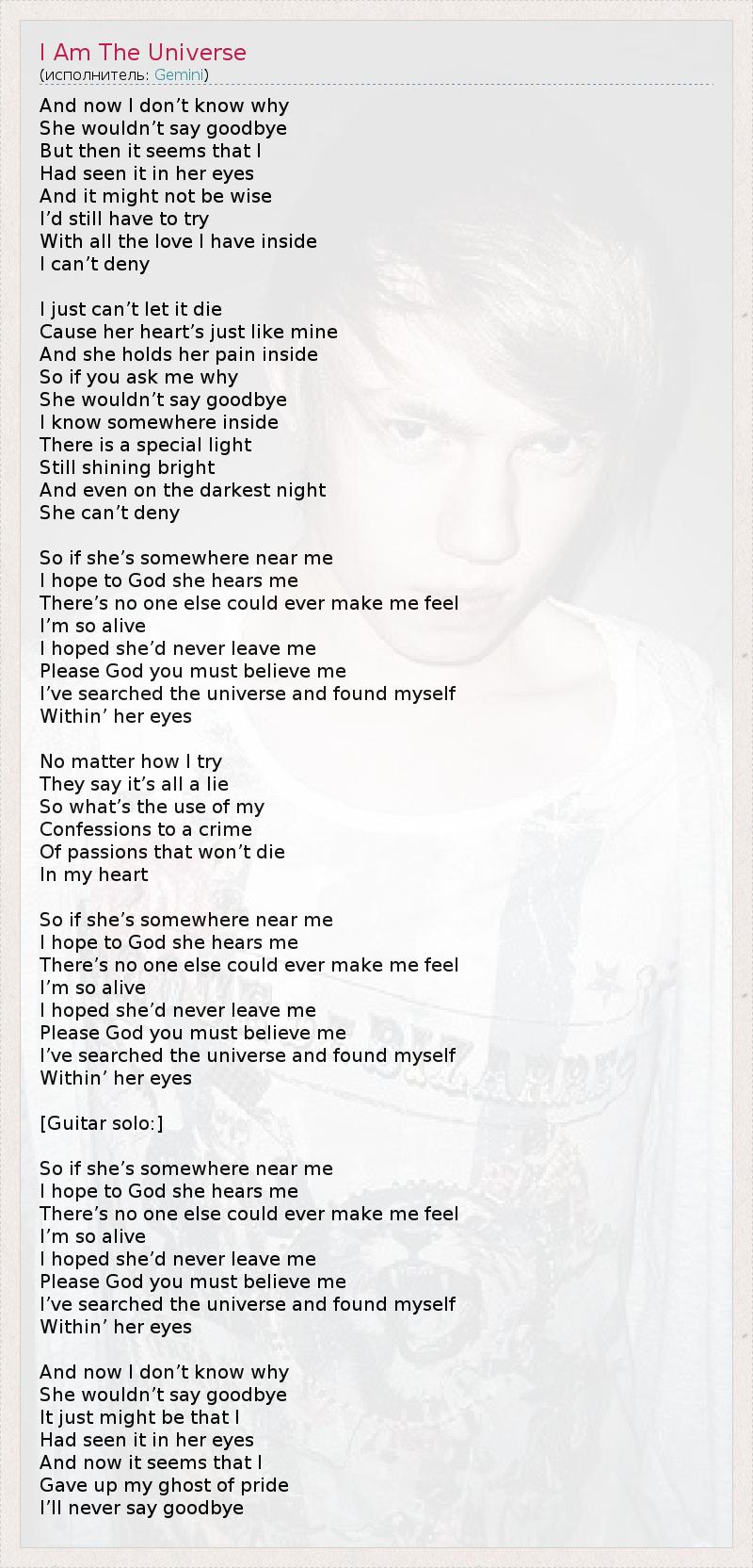 Теперь я не знаю, почему Она не сказала "Прощай!". Но мне кажется, Что я заметил это в ее глазах. И, возможно, это глупо, Но я все же еще должен попробовать, Со всей той любовью, что есть во мне, Я не могу от этого отказаться.... Я просто не могу позволить чувству умереть, Потому что ее сердце похоже на моё, И она не показывает свою боль. Поэтому, если вы спросите меня, почему Она не сказала "Прощай!" - Я знаю в глубине души, Что в ней есть особый свет, Сияющий ярко, как прежде, Даже в самую темную ночь, И она не может этого отрицать.... Если она где-то рядом со мной, Я надеюсь на Бога, что она меня слышит. Не существует больше никого, кто пробуждал бы во мне такие чувства, Я чувствую себя таким живым, Я надеялся, чтоона никогда не оставит меня... Пожалуйста, Боже, поверь мне! Я обыскал всю вселенную и нашел себя В ее глазах… Как бы я ни старалась, Говорят, что все это ложь. Тогда какой же мне смысл Раскаиваться в ошибках, совершенных Из-за страсти, которая не умрет В моем сердце... Если она где-то рядом со мной, Я надеюсь на Бога, что она меня слышит. Не существует больше никого, кто пробуждал бы во мне такие чувства, Я чувствую себя таким живым, Я надеялся, чтоона никогда не оставит меня... Пожалуйста, Боже, поверь мне! Я обыскал всю вселенную и нашел себя В ее глазах… [Cоло на гитаре:] Если она где-то рядом со мной, Я надеюсь на Бога, что она меня слышит. Не существует больше никого, кто пробуждал бы во мне такие чувства, Я чувствую себя таким живым, Я надеялся, чтоона никогда не оставит меня... Пожалуйста, Боже, поверь мне! Я обыскал всю вселенную и нашел себя В ее глазах… И теперь я не знаю, почему Она не скажет "Прощай!" Должно быть, Я видел это в ее глазах. И теперь, мне кажется, что я Прогнал свой призрак гордости, И уже никогда не скажу "Прощай!"