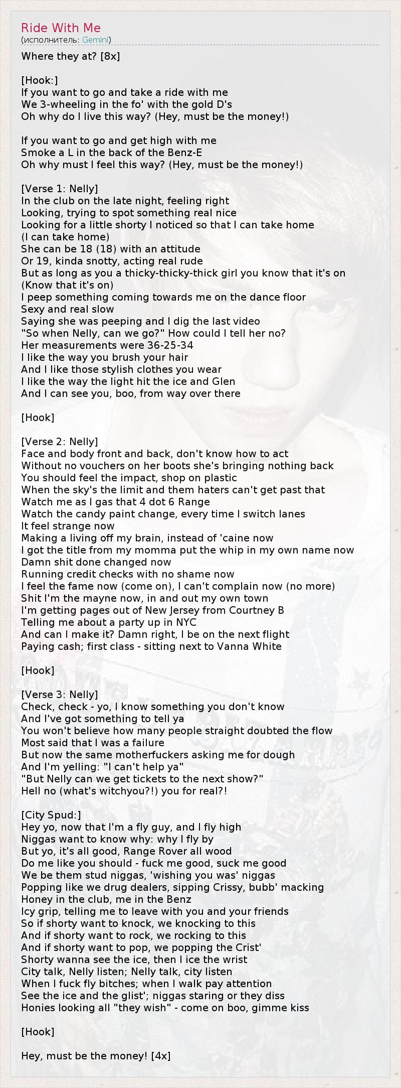Where they at? [8x] [Hook:] If you want to go and take a ride with me We 3-wheeling in the fo' with the gold D's Oh why do I live this way? (Hey, must be the money!) If you want to go and get high with me Smoke a L in the back of the Benz-E Oh why must I feel this way? (Hey, must be the money!) [Verse 1: Nelly] In the club on the late night, feeling right Looking, trying to spot something real nice Looking for a little shorty I noticed so that I can take home (I can take home) She can be 18 (18) with an attitude Or 19, kinda snotty, acting real rude But as long as you a thicky-thicky-thick girl you know that it's on (Know that it's on) I peep something coming towards me on the dance floor Sexy and real slow Saying she was peeping and I dig the last video "So when Nelly, can we go?" How could I tell her no? Her measurements were 36-25-34 I like the way you brush your hair And I like those stylish clothes you wear I like the way the light hit the ice and Glen And I can see you, boo, from way over there [Hook] [Verse 2: Nelly] Face and body front and back, don't know how to act Without no vouchers on her boots she's bringing nothing back You should feel the impact, shop on plastic When the sky's the limit and them haters can't get past that Watch me as I gas that 4 dot 6 Range Watch the candy paint change, every time I switch lanes It feel strange now Making a living off my brain, instead of 'caine now I got the title from my momma put the whip in my own name now Damn shit done changed now Running credit checks with no shame now I feel the fame now (come on), I can't complain now (no more) Shit I'm the mayne now, in and out my own town I'm getting pages out of New Jersey from Courtney B Telling me about a party up in NYC And can I make it? Damn right, I be on the next flight Paying cash; first class - sitting next to Vanna White [Hook] [Verse 3: Nelly] Check, check - yo, I know something you don't know And I've got something to tell ya You won't believe how many people straight doubted the flow Most said that I was a failure But now the same motherfuckers asking me for dough And I'm yelling: "I can't help ya" "But Nelly can we get tickets to the next show?" Hell no (what's witchyou?!) you for real?! [City Spud:] Hey yo, now that I'm a fly guy, and I fly high Niggas want to know why: why I fly by But yo, it's all good, Range Rover all wood Do me like you should - fuck me good, suck me good We be them stud niggas, 'wishing you was' niggas Popping like we drug dealers, sipping Crissy, bubb' macking Honey in the club, me in the Benz Icy grip, telling me to leave with you and your friends So if shorty want to knock, we knocking to this And if shorty want to rock, we rocking to this And if shorty want to pop, we popping the Crist' Shorty wanna see the ice, then I ice the wrist City talk, Nelly listen; Nelly talk, city listen When I fuck fly bitches; when I walk pay attention See the ice and the glist'; niggas staring or they diss Honies looking all "they wish" - come on boo, gimme kiss [Hook] Hey, must be the money! [4x]
