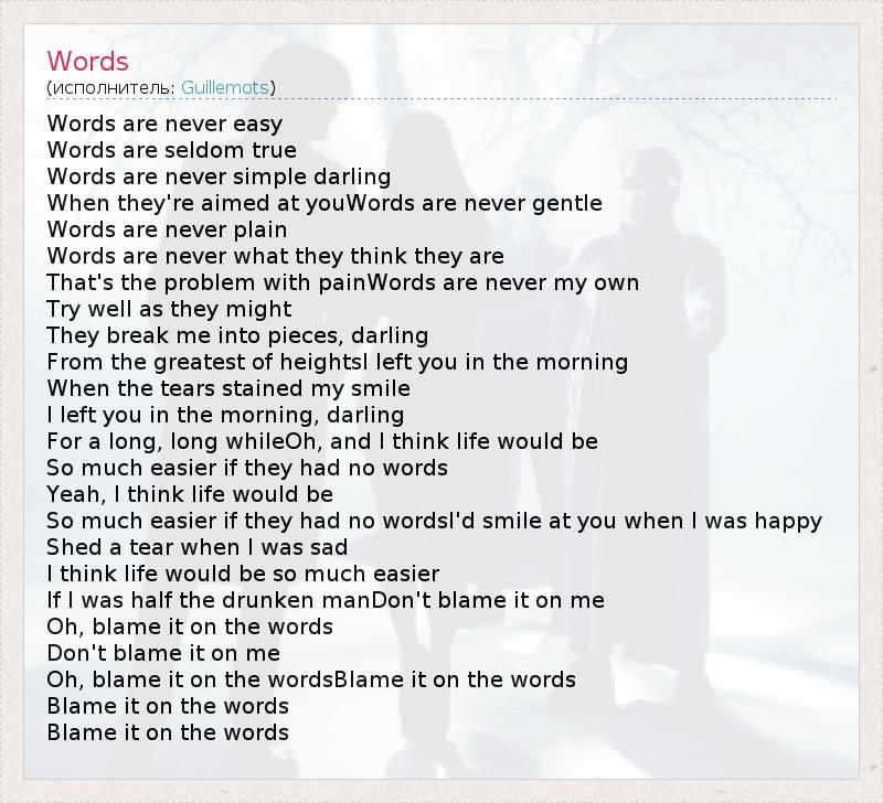 Words are never easy Words are seldom true Words are never simple darling When they're aimed at youWords are never gentle Words are never plain Words are never what they think they are That's the problem with painWords are never my own Try well as they might They break me into pieces, darling From the greatest of heightsI left you in the morning When the tears stained my smile I left you in the morning, darling For a long, long whileOh, and I think life would be So much easier if they had no words Yeah, I think life would be So much easier if they had no wordsI'd smile at you when I was happy Shed a tear when I was sad I think life would be so much easier If I was half the drunken manDon't blame it on me Oh, blame it on the words Don't blame it on me Oh, blame it on the wordsBlame it on the words Blame it on the words Blame it on the words