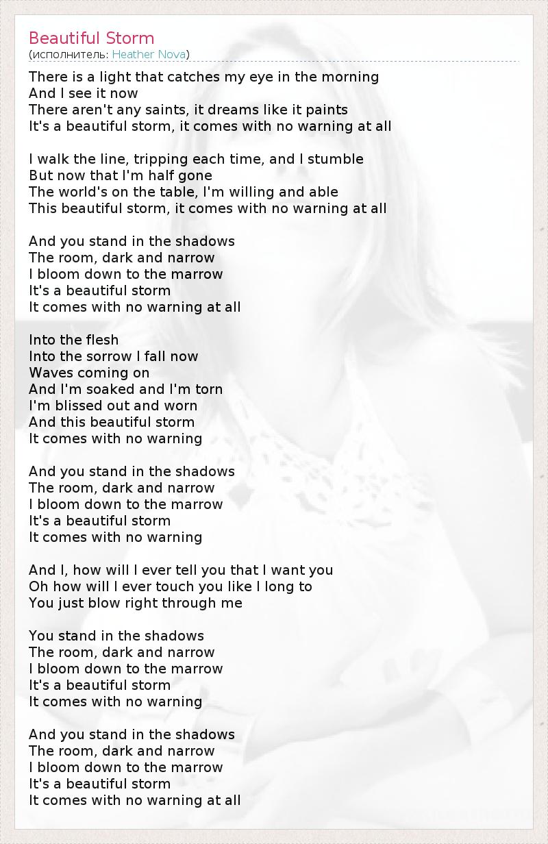 There is a light that catches my eye in the morning And I see it now There aren't any saints, it dreams like it paints It's a beautiful storm, it comes with no warning at all I walk the line, tripping each time, and I stumble But now that I'm half gone The world's on the table, I'm willing and able This beautiful storm, it comes with no warning at all And you stand in the shadows The room, dark and narrow I bloom down to the marrow It's a beautiful storm It comes with no warning at all Into the flesh Into the sorrow I fall now Waves coming on And I'm soaked and I'm torn I'm blissed out and worn And this beautiful storm It comes with no warning And you stand in the shadows The room, dark and narrow I bloom down to the marrow It's a beautiful storm It comes with no warning And I, how will I ever tell you that I want you Oh how will I ever touch you like I long to You just blow right through me You stand in the shadows The room, dark and narrow I bloom down to the marrow It's a beautiful storm It comes with no warning And you stand in the shadows The room, dark and narrow I bloom down to the marrow It's a beautiful storm It comes with no warning at all