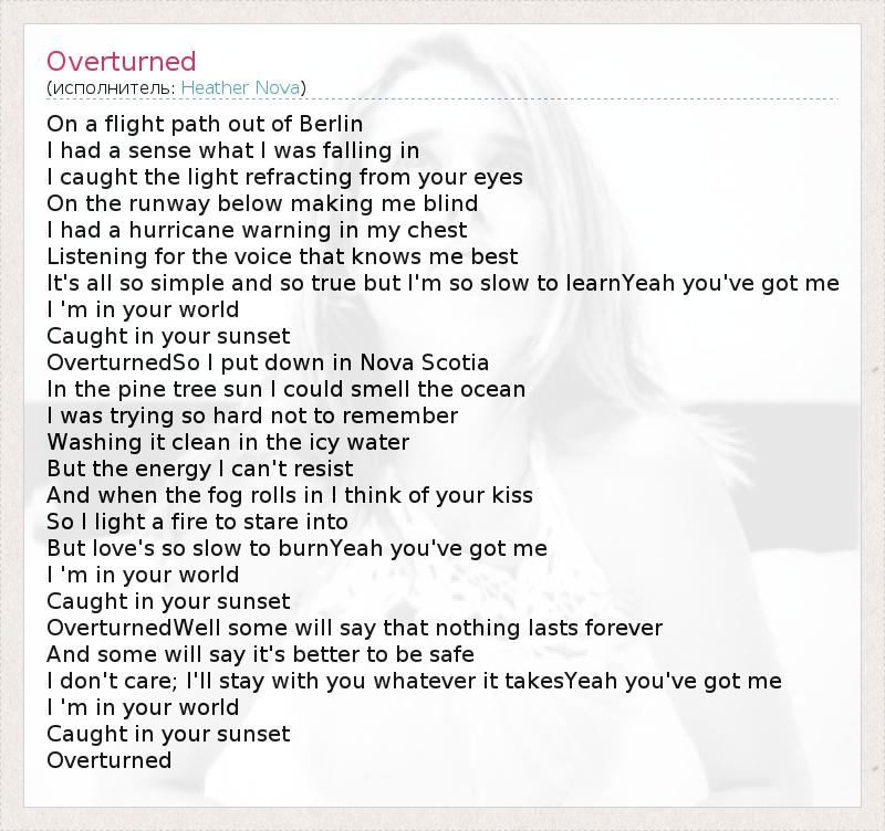 On a flight path out of Berlin I had a sense what I was falling in I caught the light refracting from your eyes On the runway below making me blind I had a hurricane warning in my chest Listening for the voice that knows me best It's all so simple and so true but I'm so slow to learnYeah you've got me I 'm in your world Caught in your sunset OverturnedSo I put down in Nova Scotia In the pine tree sun I could smell the ocean I was trying so hard not to remember Washing it clean in the icy water But the energy I can't resist And when the fog rolls in I think of your kiss So I light a fire to stare into But love's so slow to burnYeah you've got me I 'm in your world Caught in your sunset OverturnedWell some will say that nothing lasts forever And some will say it's better to be safe I don't care; I'll stay with you whatever it takesYeah you've got me I 'm in your world Caught in your sunset Overturned