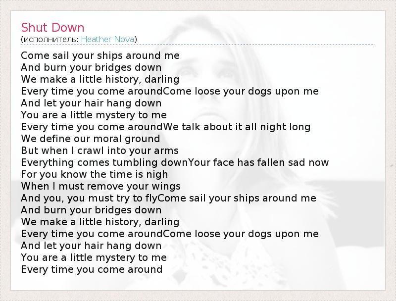 Это интересно:Heather Nova (настоящее имя Heather Allison Frith) родилась на Бермудах 6 июля 1967 года. На скрипке и гитаре Хитер начинает играть рано для своих лет, но первую песню напишет только к 12 годам. После окончания школы в Новой Англии, куда переехала её семья, в 1983 году Хитер поступила в Род-айлендскую школку дизайна (RISD), где она пробует себя в качестве автора сценария к фильмам. Она также посещала занятия по поэзии... продолжение