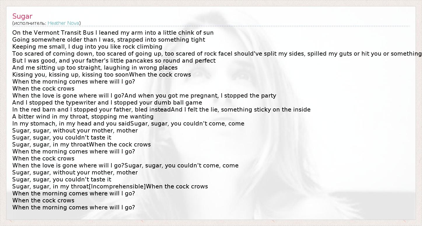 Это интересно:Heather Nova (настоящее имя Heather Allison Frith) родилась на Бермудах 6 июля 1967 года. На скрипке и гитаре Хитер начинает играть рано для своих лет, но первую песню напишет только к 12 годам. После окончания школы в Новой Англии, куда переехала её семья, в 1983 году Хитер поступила в Род-айлендскую школку дизайна (RISD), где она пробует себя в качестве автора сценария к фильмам. Она также посещала занятия по поэзии... продолжение