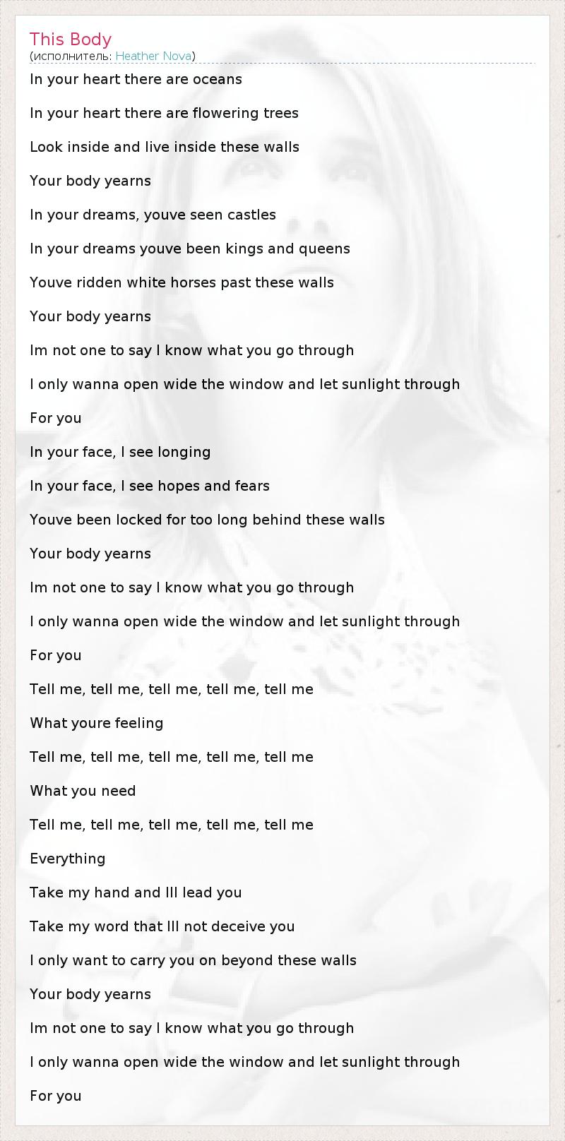 Это интересно:Heather Nova (настоящее имя Heather Allison Frith) родилась на Бермудах 6 июля 1967 года. На скрипке и гитаре Хитер начинает играть рано для своих лет, но первую песню напишет только к 12 годам. После окончания школы в Новой Англии, куда переехала её семья, в 1983 году Хитер поступила в Род-айлендскую школку дизайна (RISD), где она пробует себя в качестве автора сценария к фильмам. Она также посещала занятия по поэзии... продолжение