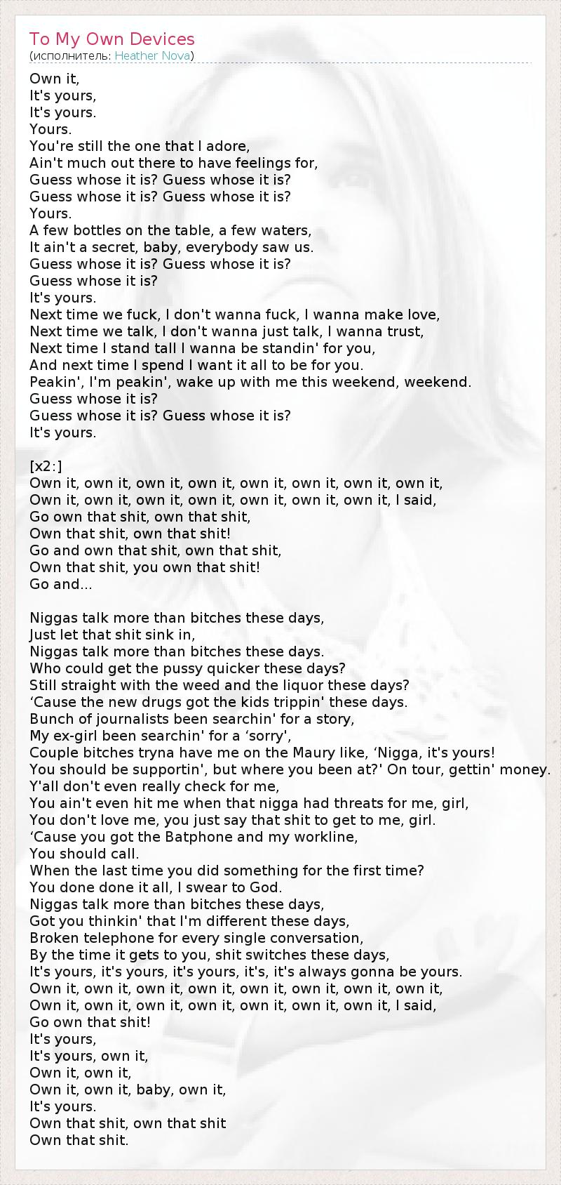 Own it, It's yours, It's yours. Yours. You're still the one that I adore, Ain't much out there to have feelings for, Guess whose it is? Guess whose it is? Guess whose it is? Guess whose it is? Yours. A few bottles on the table, a few waters, It ain't a secret, baby, everybody saw us. Guess whose it is? Guess whose it is? Guess whose it is? It's yours. Next time we fuck, I don't wanna fuck, I wanna make love, Next time we talk, I don't wanna just talk, I wanna trust, Next time I stand tall I wanna be standin' for you, And next time I spend I want it all to be for you. Peakin', I'm peakin', wake up with me this weekend, weekend. Guess whose it is? Guess whose it is? Guess whose it is? It's yours. [x2:] Own it, own it, own it, own it, own it, own it, own it, own it, Own it, own it, own it, own it, own it, own it, own it, I said, Go own that shit, own that shit, Own that shit, own that shit! Go and own that shit, own that shit, Own that shit, you own that shit! Go and... Niggas talk more than bitches these days, Just let that shit sink in, Niggas talk more than bitches these days. Who could get the pussy quicker these days? Still straight with the weed and the liquor these days? ‘Cause the new drugs got the kids trippin' these days. Bunch of journalists been searchin' for a story, My ex-girl been searchin' for a ‘sorry', Couple bitches tryna have me on the Maury like, ‘Nigga, it's yours! You should be supportin', but where you been at?' On tour, gettin' money. Y'all don't even really check for me, You ain't even hit me when that nigga had threats for me, girl, You don't love me, you just say that shit to get to me, girl. ‘Cause you got the Batphone and my workline, You should call. When the last time you did something for the first time? You done done it all, I swear to God. Niggas talk more than bitches these days, Got you thinkin' that I'm different these days, Broken telephone for every single conversation, By the time it gets to you, shit switches these days, It's yours, it's yours, it's yours, it's, it's always gonna be yours. Own it, own it, own it, own it, own it, own it, own it, own it, Own it, own it, own it, own it, own it, own it, own it, I said, Go own that shit! It's yours, It's yours, own it, Own it, own it, Own it, own it, baby, own it, It's yours. Own that shit, own that shit Own that shit.