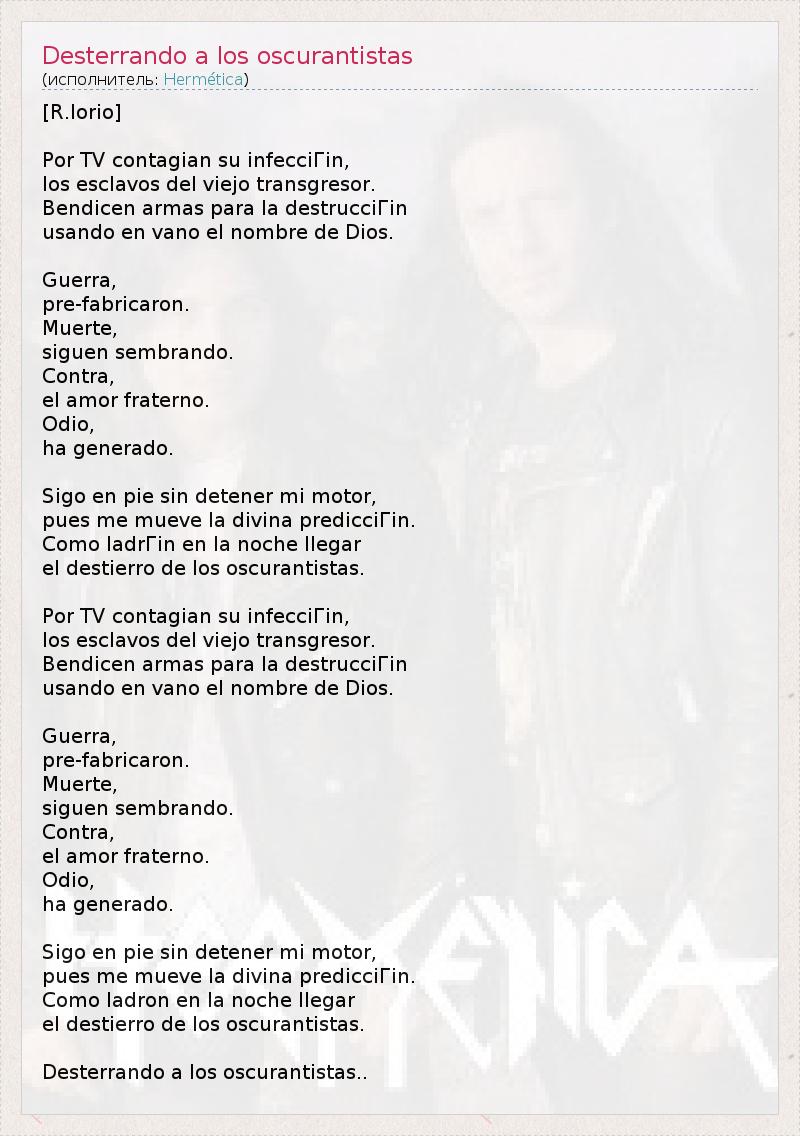 [R.Iorio] Por TV contagian su infecciГіn, los esclavos del viejo transgresor. Bendicen armas para la destrucciГіn usando en vano el nombre de Dios. Guerra, pre-fabricaron. Muerte, siguen sembrando. Contra, el amor fraterno. Odio, ha generado. Sigo en pie sin detener mi motor, pues me mueve la divina predicciГіn. Como ladrГіn en la noche llegar el destierro de los oscurantistas. Por TV contagian su infecciГіn, los esclavos del viejo transgresor. Bendicen armas para la destrucciГіn usando en vano el nombre de Dios. Guerra, pre-fabricaron. Muerte, siguen sembrando. Contra, el amor fraterno. Odio, ha generado. Sigo en pie sin detener mi motor, pues me mueve la divina predicciГіn. Como ladron en la noche llegar el destierro de los oscurantistas. Desterrando a los oscurantistas..