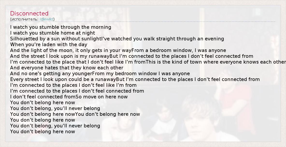 Every street I look upon could be a runawayBut I'm connected to the places I don't feel connected from