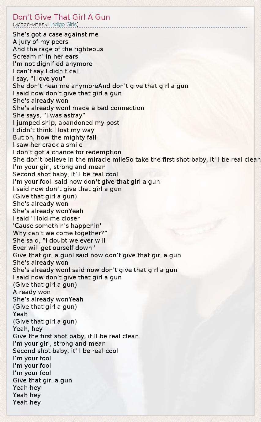 She don't hear me anymoreAnd don't give that girl a gun