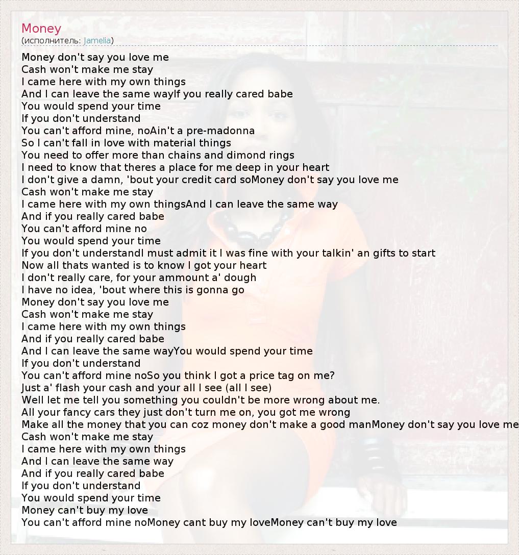 I don't give a damn, 'bout your credit card soMoney don't say you love me