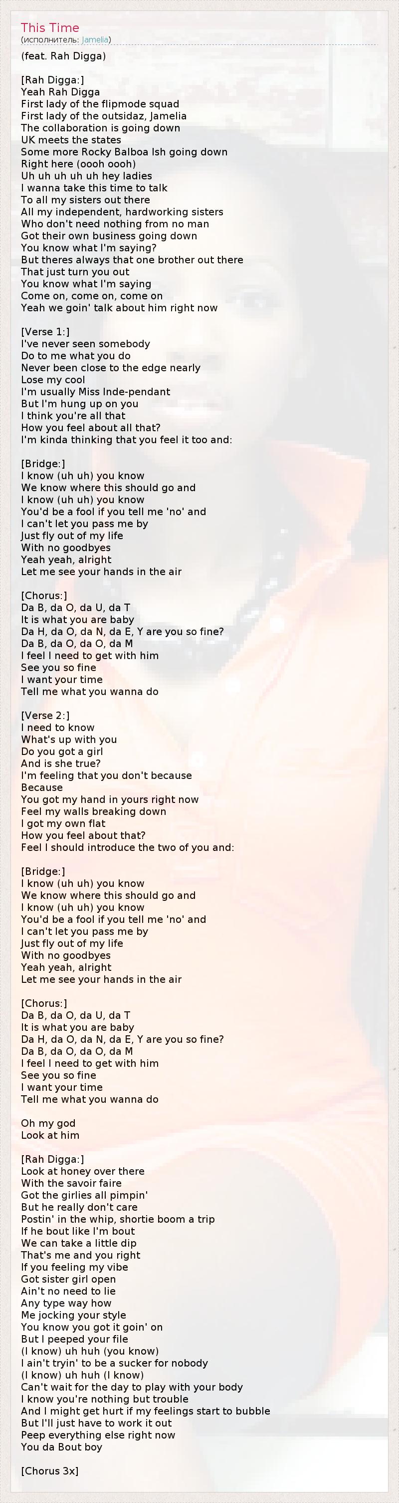 Это интересно:Jamelia Niela Davis (Джамелия Нила Девис) - британская R&B-исполнительница. В 2003 г. с песней Superstar Jamelia ворвалась в хит-парады многих европейских стран, а в Австралии и Новой Зеландии даже возглавила их. В пятнадцатилетнем возрасте на лейбле Parlophone Jamelia записывает свои первые песни, а в апреле 1999 года Jamelia выпускает сингл So High. Второй сингл I Do уже попадает в британский Топ 40. В 2000 г. выходит альбом... продолжение