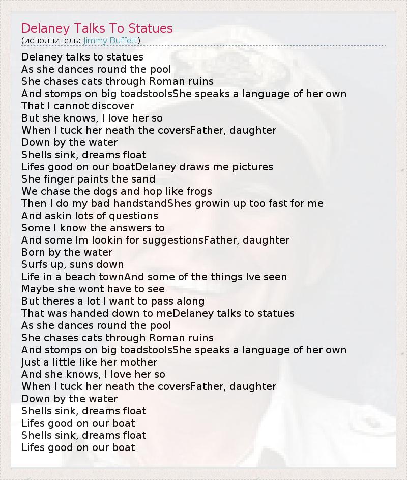 Delaney talks to statues As she dances round the pool She chases cats through Roman ruins And stomps on big toadstoolsShe speaks a language of her own That I cannot discover But she knows, I love her so When I tuck her neath the coversFather, daughter Down by the water Shells sink, dreams float Lifes good on our boatDelaney draws me pictures She finger paints the sand We chase the dogs and hop like frogs Then I do my bad handstandShes growin up too fast for me And askin lots of questions Some I know the answers to And some Im lookin for suggestionsFather, daughter Born by the water Surfs up, suns down Life in a beach townAnd some of the things Ive seen Maybe she wont have to see But theres a lot I want to pass along That was handed down to meDelaney talks to statues As she dances round the pool She chases cats through Roman ruins And stomps on big toadstoolsShe speaks a language of her own Just a little like her mother And she knows, I love her so When I tuck her neath the coversFather, daughter Down by the water Shells sink, dreams float Lifes good on our boat Shells sink, dreams float Lifes good on our boat
