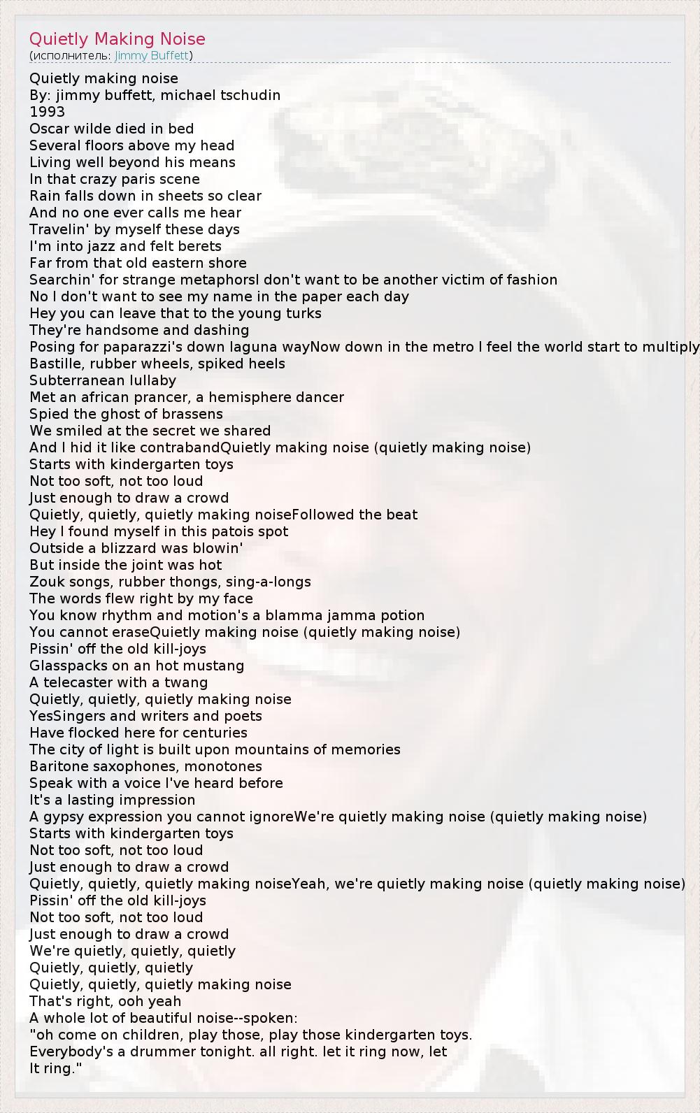 Quietly making noise By: jimmy buffett, michael tschudin 1993 Oscar wilde died in bed Several floors above my head Living well beyond his means In that crazy paris scene Rain falls down in sheets so clear And no one ever calls me hear Travelin' by myself these days I'm into jazz and felt berets Far from that old eastern shore Searchin' for strange metaphorsI don't want to be another victim of fashion No I don't want to see my name in the paper each day Hey you can leave that to the young turks They're handsome and dashing Posing for paparazzi's down laguna wayNow down in the metro I feel the world start to multiply Bastille, rubber wheels, spiked heels Subterranean lullaby Met an african prancer, a hemisphere dancer Spied the ghost of brassens We smiled at the secret we shared And I hid it like contrabandQuietly making noise (quietly making noise) Starts with kindergarten toys Not too soft, not too loud Just enough to draw a crowd Quietly, quietly, quietly making noiseFollowed the beat Hey I found myself in this patois spot Outside a blizzard was blowin' But inside the joint was hot Zouk songs, rubber thongs, sing-a-longs The words flew right by my face You know rhythm and motion's a blamma jamma potion You cannot eraseQuietly making noise (quietly making noise) Pissin' off the old kill-joys Glasspacks on an hot mustang A telecaster with a twang Quietly, quietly, quietly making noise YesSingers and writers and poets Have flocked here for centuries The city of light is built upon mountains of memories Baritone saxophones, monotones Speak with a voice I've heard before It's a lasting impression A gypsy expression you cannot ignoreWe're quietly making noise (quietly making noise) Starts with kindergarten toys Not too soft, not too loud Just enough to draw a crowd Quietly, quietly, quietly making noiseYeah, we're quietly making noise (quietly making noise) Pissin' off the old kill-joys Not too soft, not too loud Just enough to draw a crowd We're quietly, quietly, quietly Quietly, quietly, quietly Quietly, quietly, quietly making noise That's right, ooh yeah A whole lot of beautiful noise--spoken: "oh come on children, play those, play those kindergarten toys. Everybody's a drummer tonight. all right. let it ring now, let It ring."