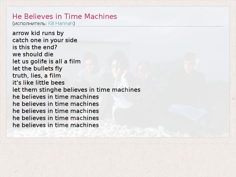 А как ты думаешь, о чем песня "He Believes in Time Machines" ?