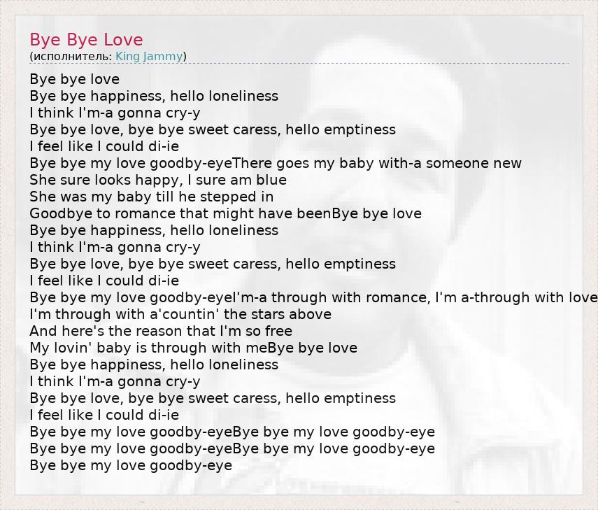 Bye bye love Bye bye happiness, hello loneliness I think I'm-a gonna cry-y Bye bye love, bye bye sweet caress, hello emptiness I feel like I could di-ie Bye bye my love goodby-eyeThere goes my baby with-a someone new She sure looks happy, I sure am blue She was my baby till he stepped in Goodbye to romance that might have beenBye bye love Bye bye happiness, hello loneliness I think I'm-a gonna cry-y Bye bye love, bye bye sweet caress, hello emptiness I feel like I could di-ie Bye bye my love goodby-eyeI'm-a through with romance, I'm a-through with love I'm through with a'countin' the stars above And here's the reason that I'm so free My lovin' baby is through with meBye bye love Bye bye happiness, hello loneliness I think I'm-a gonna cry-y Bye bye love, bye bye sweet caress, hello emptiness I feel like I could di-ie Bye bye my love goodby-eyeBye bye my love goodby-eye Bye bye my love goodby-eyeBye bye my love goodby-eye Bye bye my love goodby-eye