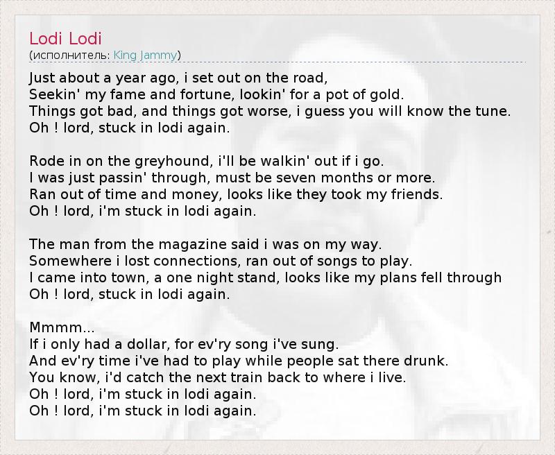 Just about a year ago, i set out on the road, Seekin' my fame and fortune, lookin' for a pot of gold. Things got bad, and things got worse, i guess you will know the tune. Oh ! lord, stuck in lodi again. Rode in on the greyhound, i'll be walkin' out if i go. I was just passin' through, must be seven months or more. Ran out of time and money, looks like they took my friends. Oh ! lord, i'm stuck in lodi again. The man from the magazine said i was on my way. Somewhere i lost connections, ran out of songs to play. I came into town, a one night stand, looks like my plans fell through Oh ! lord, stuck in lodi again. Mmmm... If i only had a dollar, for ev'ry song i've sung. And ev'ry time i've had to play while people sat there drunk. You know, i'd catch the next train back to where i live. Oh ! lord, i'm stuck in lodi again. Oh ! lord, i'm stuck in lodi again.