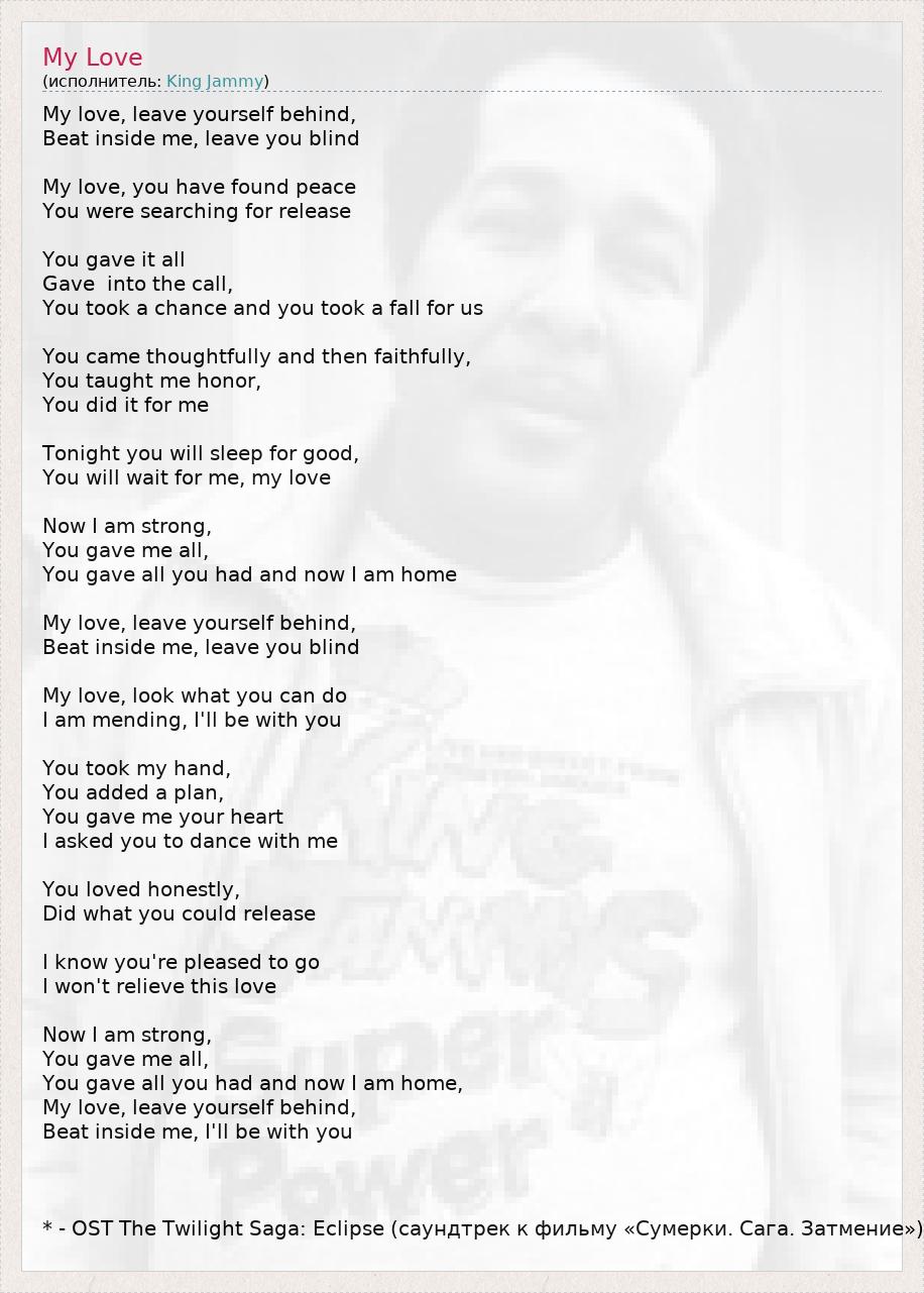 My love, leave yourself behind, Beat inside me, leave you blind My love, you have found peace You were searching for release You gave it all Gave into the call, You took a chance and you took a fall for us You came thoughtfully and then faithfully, You taught me honor, You did it for me Tonight you will sleep for good, You will wait for me, my love Now I am strong, You gave me all, You gave all you had and now I am home My love, leave yourself behind, Beat inside me, leave you blind My love, look what you can do I am mending, I'll be with you You took my hand, You added a plan, You gave me your heart I asked you to dance with me You loved honestly, Did what you could release I know you're pleased to go I won't relieve this love Now I am strong, You gave me all, You gave all you had and now I am home, My love, leave yourself behind, Beat inside me, I'll be with you * - OST The Twilight Saga: Eclipse (саундтрек к фильму «Сумерки. Сага. Затмение»)