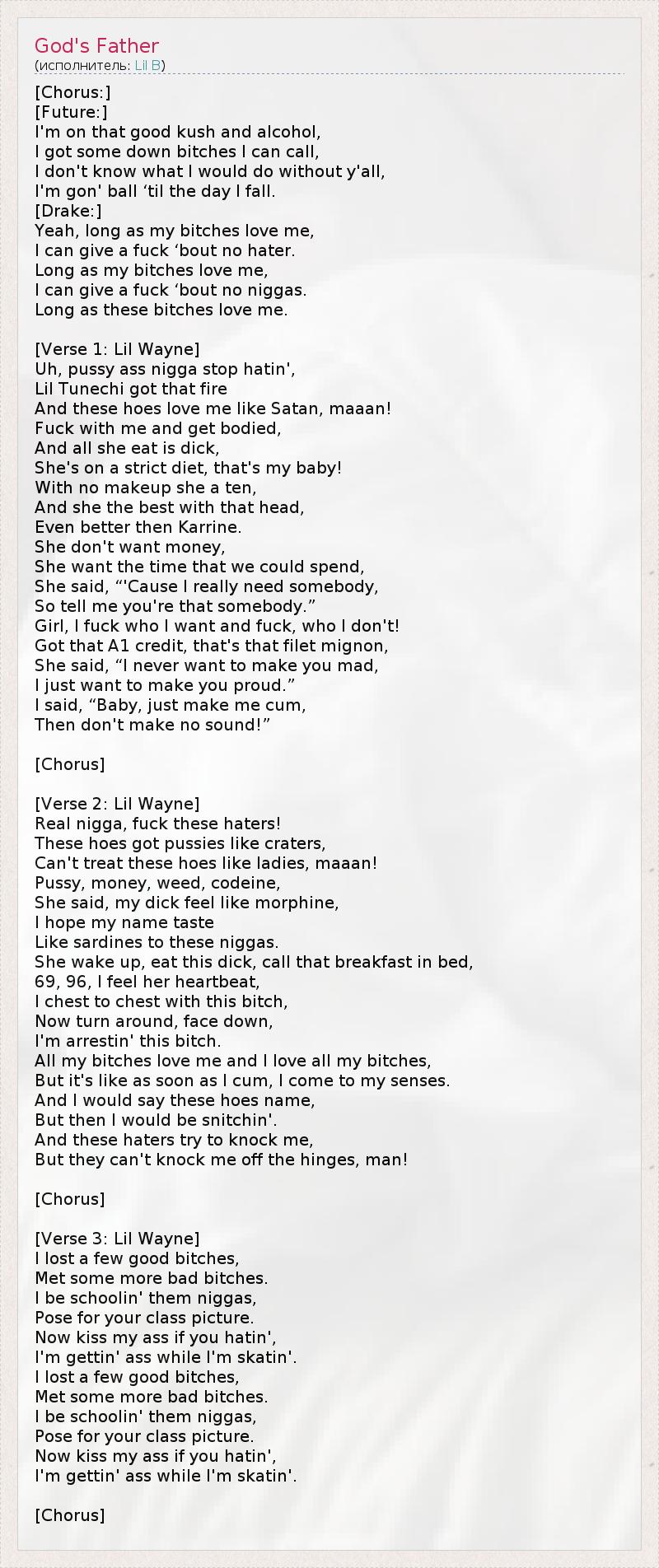 [Chorus:] [Future:] I'm on that good kush and alcohol, I got some down bitches I can call, I don't know what I would do without y'all, I'm gon' ball ‘til the day I fall. [Drake:] Yeah, long as my bitches love me, I can give a fuck ‘bout no hater. Long as my bitches love me, I can give a fuck ‘bout no niggas. Long as these bitches love me. [Verse 1: Lil Wayne] Uh, pussy ass nigga stop hatin', Lil Tunechi got that fire And these hoes love me like Satan, maaan! Fuck with me and get bodied, And all she eat is dick, She's on a strict diet, that's my baby! With no makeup she a ten, And she the best with that head, Even better then Karrine. She don't want money, She want the time that we could spend, She said, “'Cause I really need somebody, So tell me you're that somebody.” Girl, I fuck who I want and fuck, who I don't! Got that A1 credit, that's that filet mignon, She said, “I never want to make you mad, I just want to make you proud.” I said, “Baby, just make me cum, Then don't make no sound!” [Chorus] [Verse 2: Lil Wayne] Real nigga, fuck these haters! These hoes got pussies like craters, Can't treat these hoes like ladies, maaan! Pussy, money, weed, codeine, She said, my dick feel like morphine, I hope my name taste Like sardines to these niggas. She wake up, eat this dick, call that breakfast in bed, 69, 96, I feel her heartbeat, I chest to chest with this bitch, Now turn around, face down, I'm arrestin' this bitch. All my bitches love me and I love all my bitches, But it's like as soon as I cum, I come to my senses. And I would say these hoes name, But then I would be snitchin'. And these haters try to knock me, But they can't knock me off the hinges, man! [Chorus] [Verse 3: Lil Wayne] I lost a few good bitches, Met some more bad bitches. I be schoolin' them niggas, Pose for your class picture. Now kiss my ass if you hatin', I'm gettin' ass while I'm skatin'. I lost a few good bitches, Met some more bad bitches. I be schoolin' them niggas, Pose for your class picture. Now kiss my ass if you hatin', I'm gettin' ass while I'm skatin'. [Chorus]