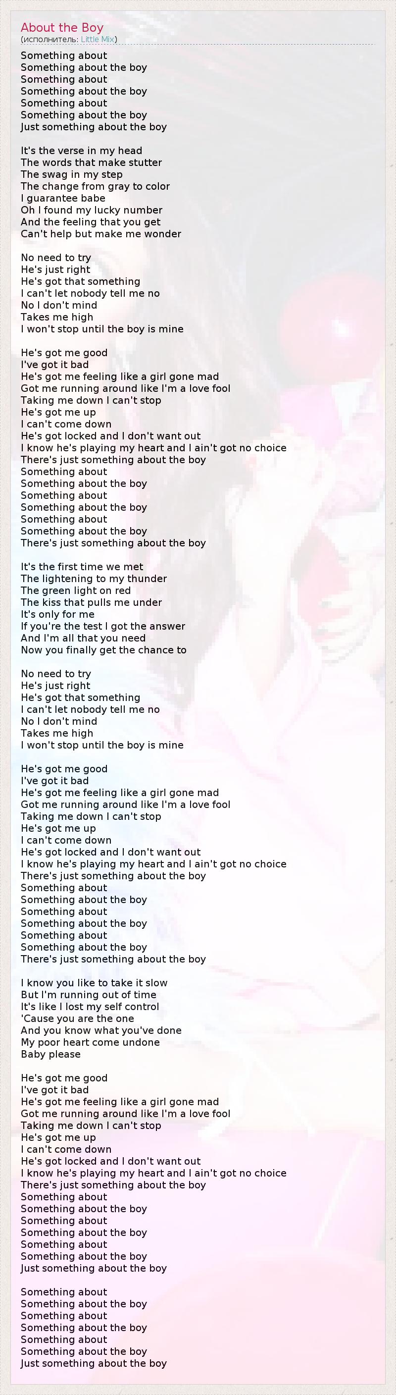 Это интересно:Little Mix (ранее известные как Rhythmix) британский girls-band состоящий из четырех участниц: Perrie Edwards, Jesy Nelson, Leigh-Anne Pinnock и Jade Thirlwall. Получили известность благодаря участию в девятом сезоне реалити шоу X-Factor. Девушки одержали победу и стали первой группой, которая выиграла на X-Factor за 9 лет существования.Perrie Edwards, Jesy Nelson, Leigh-Anne Pinnock и Jade Thirlwall успешно прошли этапы прослушивания для... продолжение