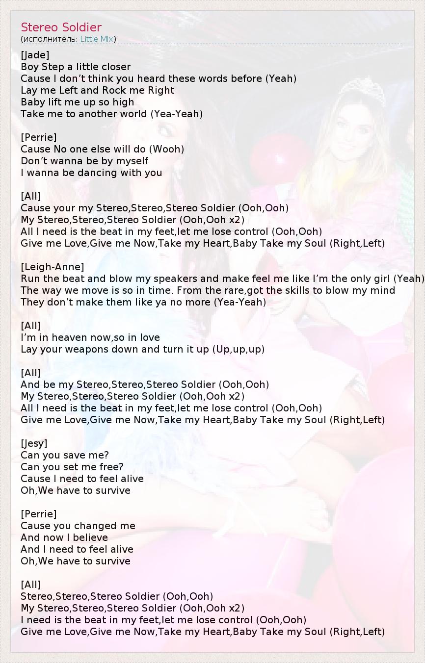 [Jade] Boy Step a little closer Cause I don’t think you heard these words before (Yeah) Lay me Left and Rock me Right Baby lift me up so high Take me to another world (Yea-Yeah) [Perrie] Cause No one else will do (Wooh) Don’t wanna be by myself I wanna be dancing with you [All] Cause your my Stereo,Stereo,Stereo Soldier (Ooh,Ooh) My Stereo,Stereo,Stereo Soldier (Ooh,Ooh x2) All I need is the beat in my feet,let me lose control (Ooh,Ooh) Give me Love,Give me Now,Take my Heart,Baby Take my Soul (Right,Left) [Leigh-Anne] Run the beat and blow my speakers and make feel me like I’m the only girl (Yeah) The way we move is so in time. From the rare,got the skills to blow my mind They don’t make them like ya no more (Yea-Yeah) [All] I’m in heaven now,so in love Lay your weapons down and turn it up (Up,up,up) [All] And be my Stereo,Stereo,Stereo Soldier (Ooh,Ooh) My Stereo,Stereo,Stereo Soldier (Ooh,Ooh x2) All I need is the beat in my feet,let me lose control (Ooh,Ooh) Give me Love,Give me Now,Take my Heart,Baby Take my Soul (Right,Left) [Jesy] Can you save me? Can you set me free? Cause I need to feel alive Oh,We have to survive [Perrie] Cause you changed me And now I believe And I need to feel alive Oh,We have to survive [All] Stereo,Stereo,Stereo Soldier (Ooh,Ooh) My Stereo,Stereo,Stereo Soldier (Ooh,Ooh x2) I need is the beat in my feet,let me lose control (Ooh,Ooh) Give me Love,Give me Now,Take my Heart,Baby Take my Soul (Right,Left)