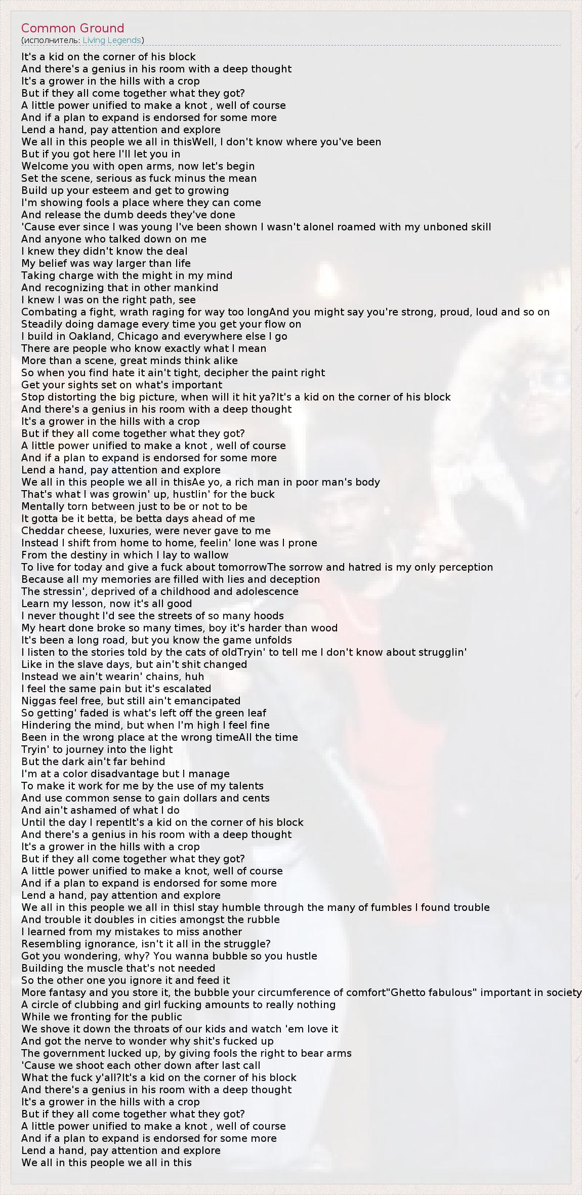 Это интересно:Living Legends образовались в городе Оклэнд. Вначале был дуэт Mystik Journeymen состоящий из Sunspot Jonz и Luckyiam. Они рассылали свои демо-записи обычным людям по почте и учавствовали в шоу "Underground Survivors" в Восточном Окленде. Эти полу-концерты полу-вечеринки проводили, чтобы поддержать молодых независимых Хип-Хоп исполнителей.В... продолжение