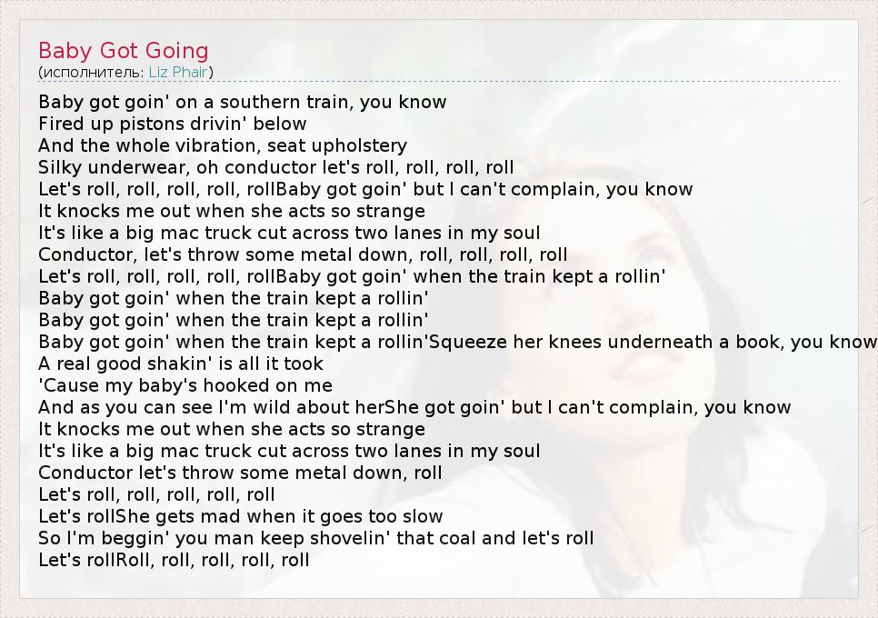 Baby got goin' on a southern train, you know Fired up pistons drivin' below And the whole vibration, seat upholstery Silky underwear, oh conductor let's roll, roll, roll, roll Let's roll, roll, roll, roll, rollBaby got goin' but I can't complain, you know It knocks me out when she acts so strange It's like a big mac truck cut across two lanes in my soul Conductor, let's throw some metal down, roll, roll, roll, roll Let's roll, roll, roll, roll, rollBaby got goin' when the train kept a rollin' Baby got goin' when the train kept a rollin' Baby got goin' when the train kept a rollin' Baby got goin' when the train kept a rollin'Squeeze her knees underneath a book, you know A real good shakin' is all it took 'Cause my baby's hooked on me And as you can see I'm wild about herShe got goin' but I can't complain, you know It knocks me out when she acts so strange It's like a big mac truck cut across two lanes in my soul Conductor let's throw some metal down, roll Let's roll, roll, roll, roll, roll Let's rollShe gets mad when it goes too slow So I'm beggin' you man keep shovelin' that coal and let's roll Let's rollRoll, roll, roll, roll, roll