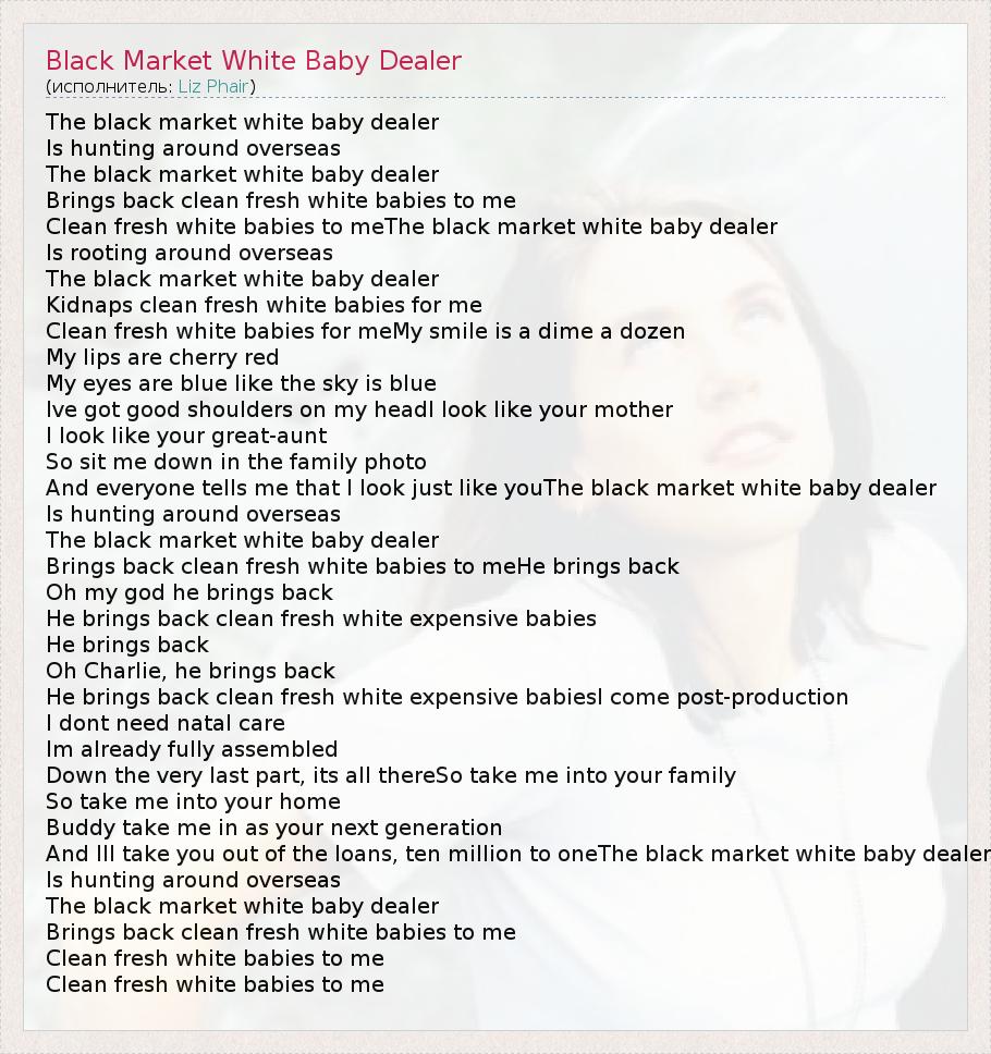 The black market white baby dealer Is hunting around overseas The black market white baby dealer Brings back clean fresh white babies to me Clean fresh white babies to meThe black market white baby dealer Is rooting around overseas The black market white baby dealer Kidnaps clean fresh white babies for me Clean fresh white babies for meMy smile is a dime a dozen My lips are cherry red My eyes are blue like the sky is blue Ive got good shoulders on my headI look like your mother I look like your great-aunt So sit me down in the family photo And everyone tells me that I look just like youThe black market white baby dealer Is hunting around overseas The black market white baby dealer Brings back clean fresh white babies to meHe brings back Oh my god he brings back He brings back clean fresh white expensive babies He brings back Oh Charlie, he brings back He brings back clean fresh white expensive babiesI come post-production I dont need natal care Im already fully assembled Down the very last part, its all thereSo take me into your family So take me into your home Buddy take me in as your next generation And Ill take you out of the loans, ten million to oneThe black market white baby dealer Is hunting around overseas The black market white baby dealer Brings back clean fresh white babies to me Clean fresh white babies to me Clean fresh white babies to me