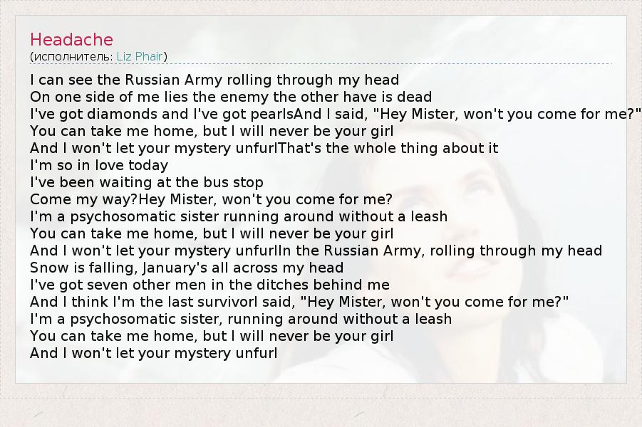 I can see the Russian Army rolling through my head On one side of me lies the enemy the other have is dead I've got diamonds and I've got pearlsAnd I said, "Hey Mister, won't you come for me?" You can take me home, but I will never be your girl And I won't let your mystery unfurlThat's the whole thing about it I'm so in love today I've been waiting at the bus stop Come my way?Hey Mister, won't you come for me? I'm a psychosomatic sister running around without a leash You can take me home, but I will never be your girl And I won't let your mystery unfurlIn the Russian Army, rolling through my head Snow is falling, January's all across my head I've got seven other men in the ditches behind me And I think I'm the last survivorI said, "Hey Mister, won't you come for me?" I'm a psychosomatic sister, running around without a leash You can take me home, but I will never be your girl And I won't let your mystery unfurl