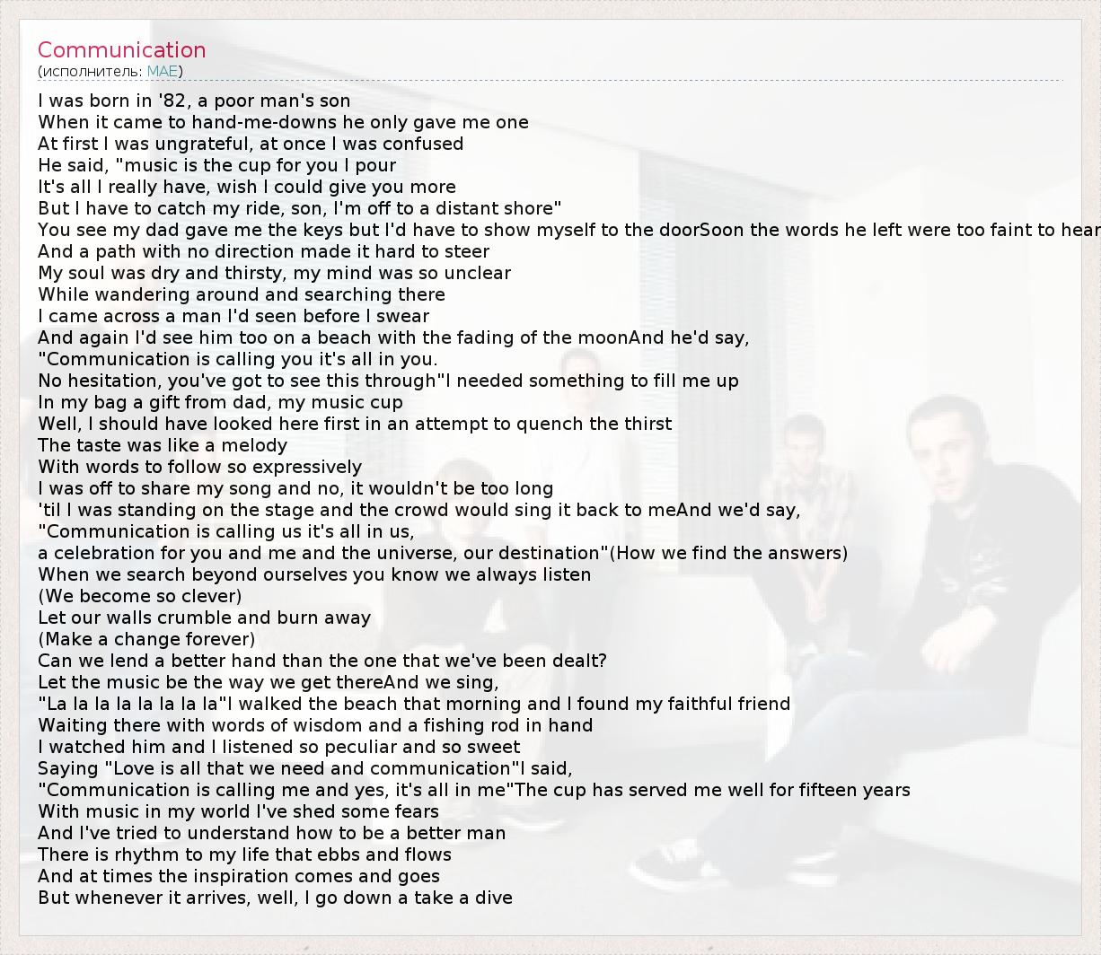 Это интересно:Группа "Mae" была образована в 2001-м в Норфолке (штат Виржиния). Название Mae - это аббревиатура Multisensory Aesthetic Experience, и эти “мульти-сенсорные эстеты” привнесли своих красок в квази-имо-ветку, выросшую на почве увядающего имо-рока.Почти все они были связаны с музыкой с самого детства. Иаков родился в семье хиппи (эстетских), и с раннего детства в их доме звучала музыка с утра до ночи. Зак... продолжение