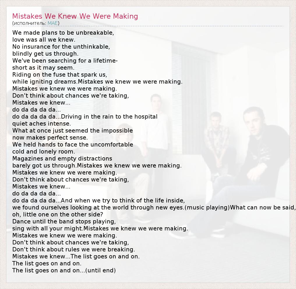We made plans to be unbreakable, love was all we knew. No insurance for the unthinkable, blindly get us through. We've been searching for a lifetime- short as it may seem. Riding on the fuse that spark us, while igniting dreams.Mistakes we knew we were making. Mistakes we knew we were making. Don't think about chances we're taking, Mistakes we knew... do da da da da... do da da da da...Driving in the rain to the hospital quiet aches intense. What at once just seemed the impossible now makes perfect sense. We held hands to face the uncomfortable cold and lonely room. Magazines and empty distractions barely got us through.Mistakes we knew we were making. Mistakes we knew we were making. Don't think about chances we're taking, Mistakes we knew... do da da da da... do da da da da...And when we try to think of the life inside, we found ourselves looking at the world through new eyes.(music playing)What can now be said, oh, little one on the other side? Dance until the band stops playing, sing with all your might.Mistakes we knew we were making. Mistakes we knew we were making. Don't think about chances we're taking, Don't think about rules we were breaking. Mistakes we knew...The list goes on and on. The list goes on and on. The list goes on and on...(until end)
