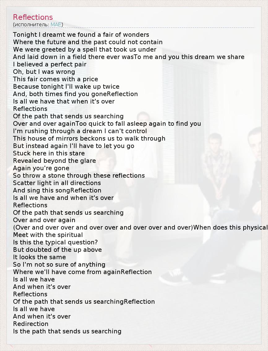 Tonight I dreamt we found a fair of wonders Where the future and the past could not contain We were greeted by a spell that took us under And laid down in a field there ever wasTo me and you this dream we share I believed a perfect pair Oh, but I was wrong This fair comes with a price Because tonight I'll wake up twice And, both times find you goneReflection Is all we have that when it's over Reflections Of the path that sends us searching Over and over againToo quick to fall asleep again to find you I'm rushing through a dream I can't control This house of mirrors beckons us to walk through But instead again I'll have to let you go Stuck here in this stare Revealed beyond the glare Again you're gone So throw a stone through these reflections Scatter light in all directions And sing this songReflection Is all we have and when it's over Reflections Of the path that sends us searching Over and over again (Over and over over and over over and over over and over)When does this physical Meet with the spiritual Is this the typical question? But doubted of the up above It looks the same So I'm not so sure of anything Where we'll have come from againReflection Is all we have And when it's over Reflections Of the path that sends us searchingReflection Is all we have And when it's over Redirection Is the path that sends us searching
