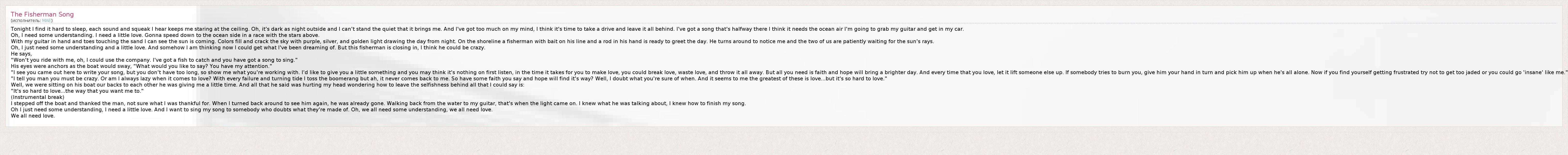 I stepped off the boat and thanked the man, not sure what I was thankful for. When I turned back around to see him again, he was already gone. Walking back from the water to my guitar, that's when the light came on. I knew what he was talking about, I knew how to finish my song.